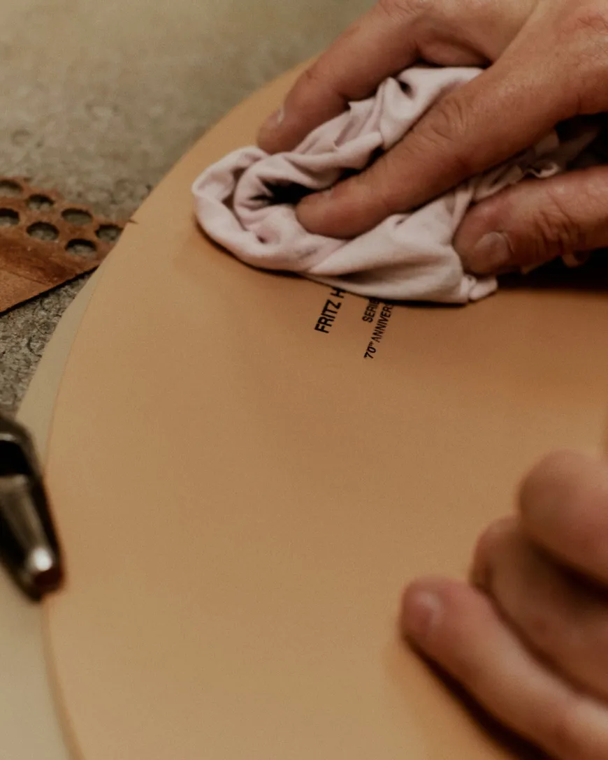 Sædet er beklædt med kraftigt sadellæder, der smyger sig om stolens organiske kurver. Syningerne og den markerede kant fremhæver silhuetten og tilfører associationer til fin lædervarekunst – raffineret som en håndtaske eller en sadel, skabt med kompromisløs sans for detaljen.