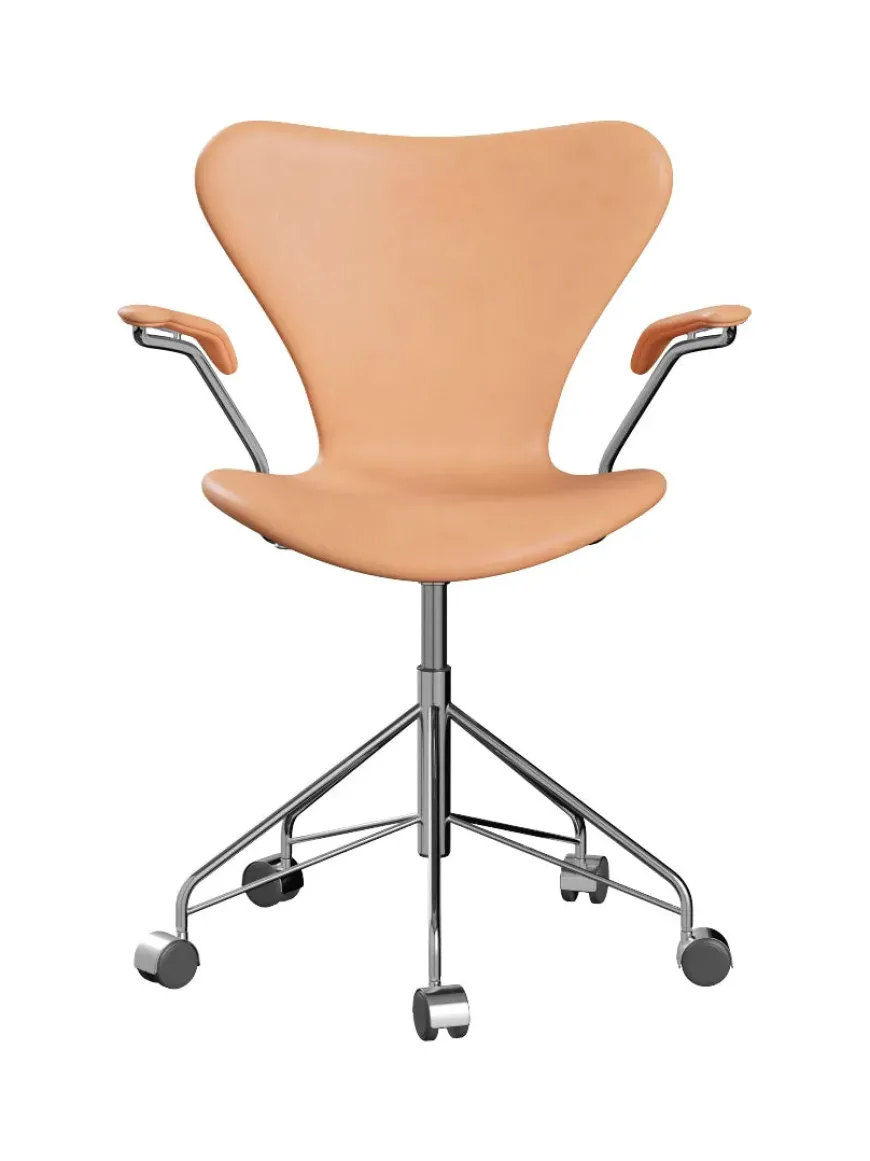 En vaskeægte klassiker. 3217 drejearmstolen af Arne Jacobsen er designet tilbage i 1950’erne. Designet er i dag lige så aktuelt, som det var dengang. 7’er kontorstolen er et klassisk stykke design, der både er funktionelt og smukt at se på. Oplev komforten ved Arne Jacobsens verdensberømte syver-stol ved skrivebordet. Kontorstolen er med armlæn fra Fritz Hansen og med forkromet stel. Vælg stolen i følgende udgaver: – Farvet ask – Natur finer – Lakeret – Fuldpolstret læder Hjul/bremser: Hårde baner til bløde gulve, u/brems Hårde baner til bløde gulve, m/brems Bløde baner til hårde gulve, u/brems Bløde baner til hårde gulve, m/brems.