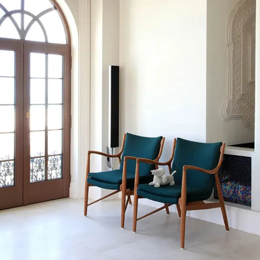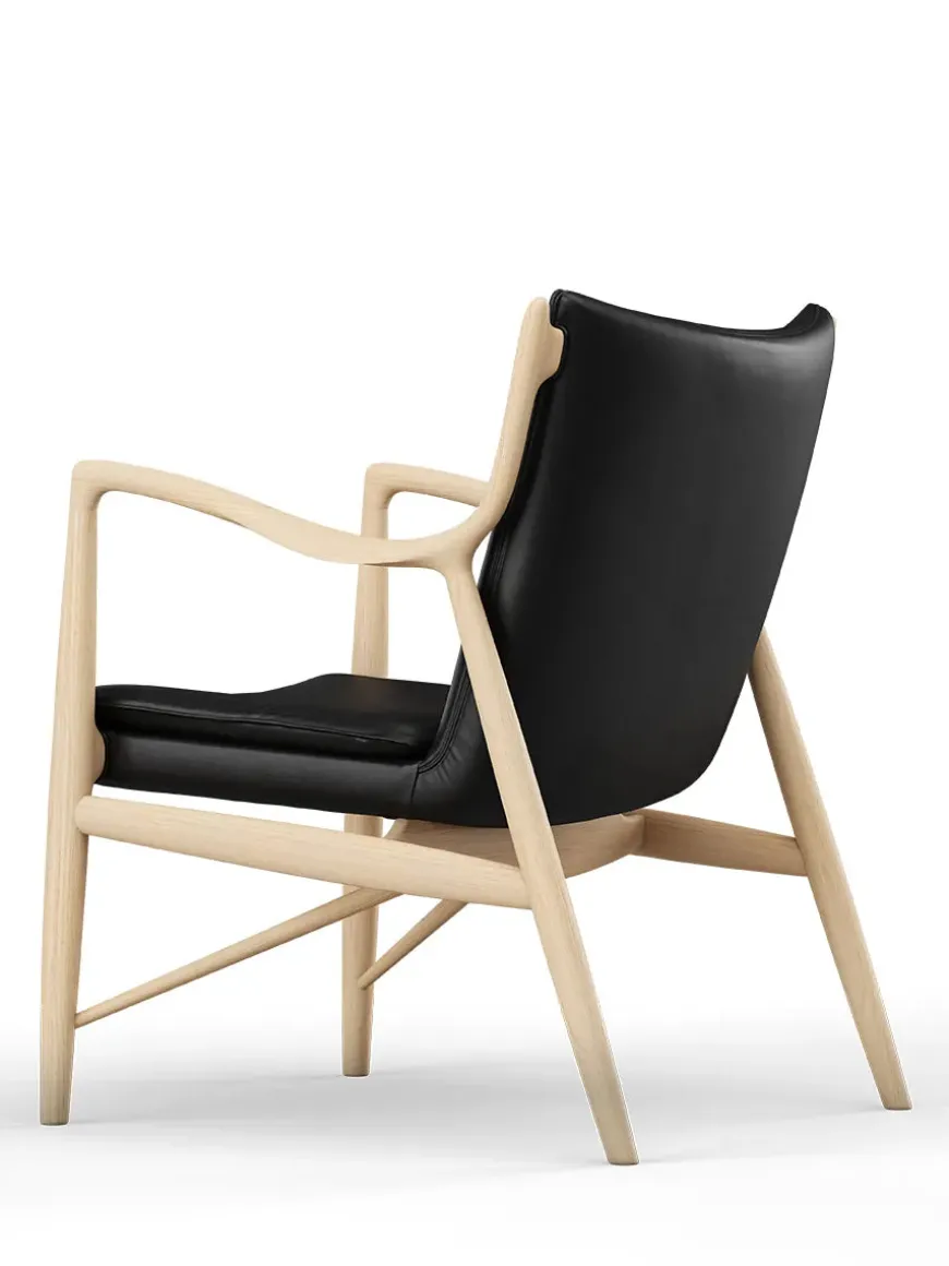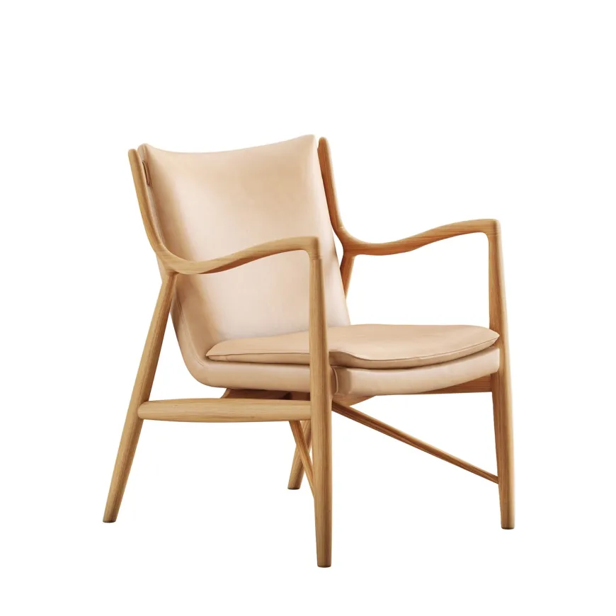 45 Lænestolen af Finn Juhl er et ikon inden for dansk design og betragtes som et mesterværk af moderne møbelkunst. Designet i 1945, var stolen revolutionerende for sin tid med sin organiske form og innovative konstruktion, hvor sæde og ryg nærmest svæver frit fra stellet. Stolen er håndlavet med en ramme af massivt egetræ i klar olie, og polstret med det lækreste Elegance læder. De elegante, skulpturelle armlæn og den gennemtænkte ergonomi sikrer både æstetik og komfort. 45 Lænestolen er en tidløs klassiker, der fortsat fremstilles af House of Finn Juhl med fokus på høj kvalitet og traditionelt håndværk.