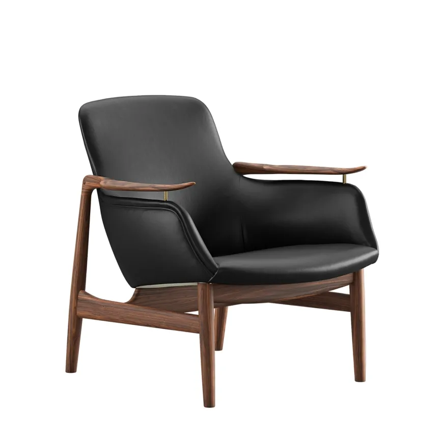 FJ 53 præsenterer sig som et ekstravagant møbel, hvor den klassiske træstols lethed kombineres med et polstret korpus, der giver en omsluttende og behagelig komfort. Finn Juhls særlige designprincip – den tydelige adskillelse mellem det bærende og det bårne – er smukt videreført i FJ 53 og udført med en særlig finesse, der tilfører møblet en let og elegant fremtoning.