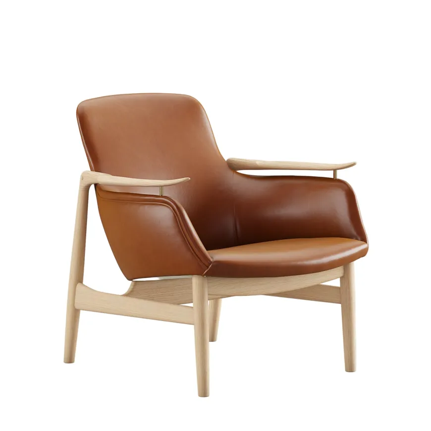 I varianten med stel i eg klar olie står træets lyse og naturlige udtryk skarpt frem. Bagbenene er helt fritlagte fra polstringen og rejser sig fra gulvet i en organisk, ubrudt bevægelse, der fortsætter ud i armlænet. Det formede armlæn hviler let svævende over polstringen og afsluttes i en blød, svagt opadgående spids, der næsten kalder på at blive rørt ved.