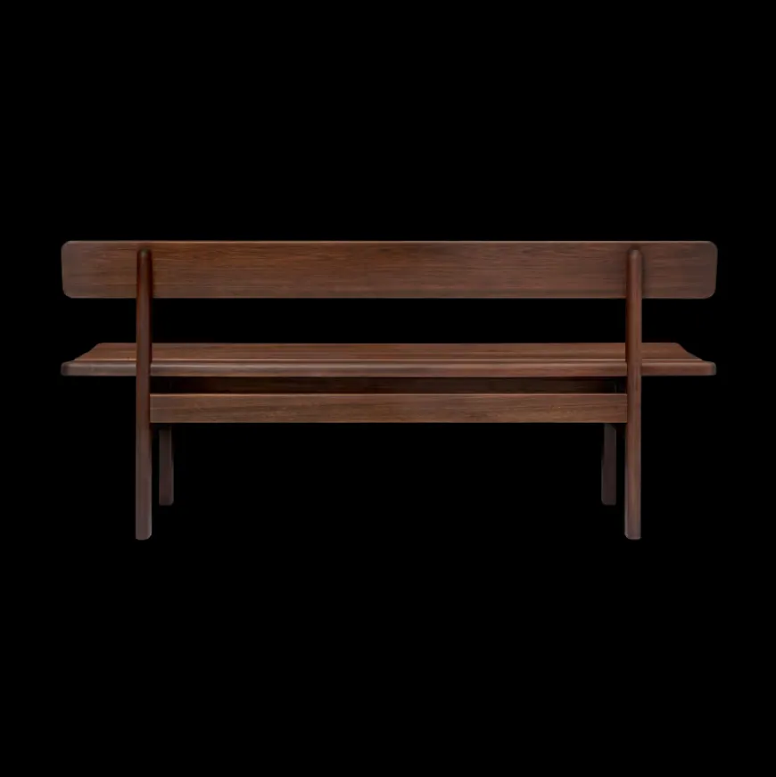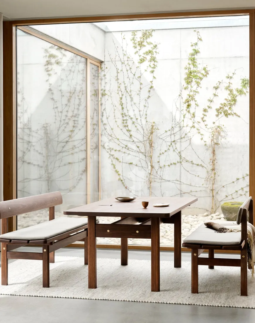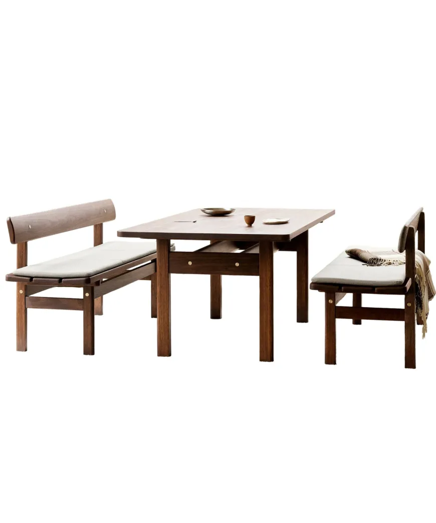 Asserbo sættet forener Børge Mogensens jordnære funktionalitet med en varm, indbydende æstetik. Det solide eukalyptustræ får en smuk glød i den mørkolierede overflade, mens de synlige skruer i børstet messing giver serien et ærligt og robust udtryk. Formen er blødt afrundet og inspireret af Shaker traditionen, skabt i 1961 til Mogensens eget sommerhus i Asserbo. Med bænke og løse sædehynder i slidstærke tekstiler bliver spisemiljøet både fleksibelt og behageligt til hverdag og gæster.
