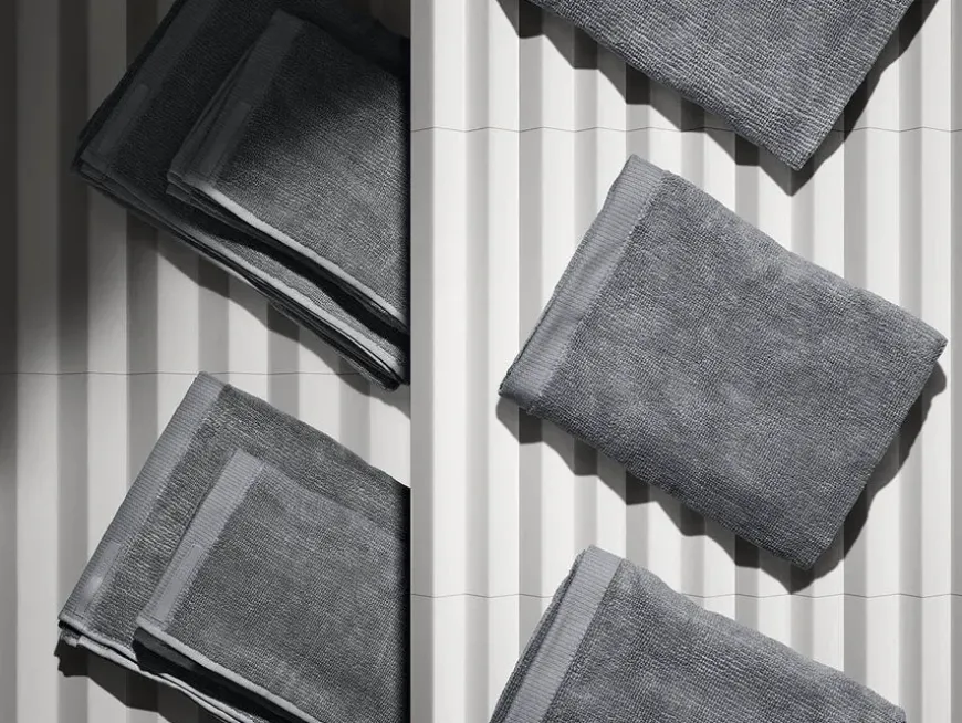 Håndklæderne er udstyret med en solid gummistrop og fås i tre versioner – gæstehåndklæde, håndklæde og badehåndklæde.