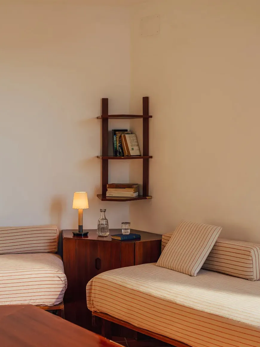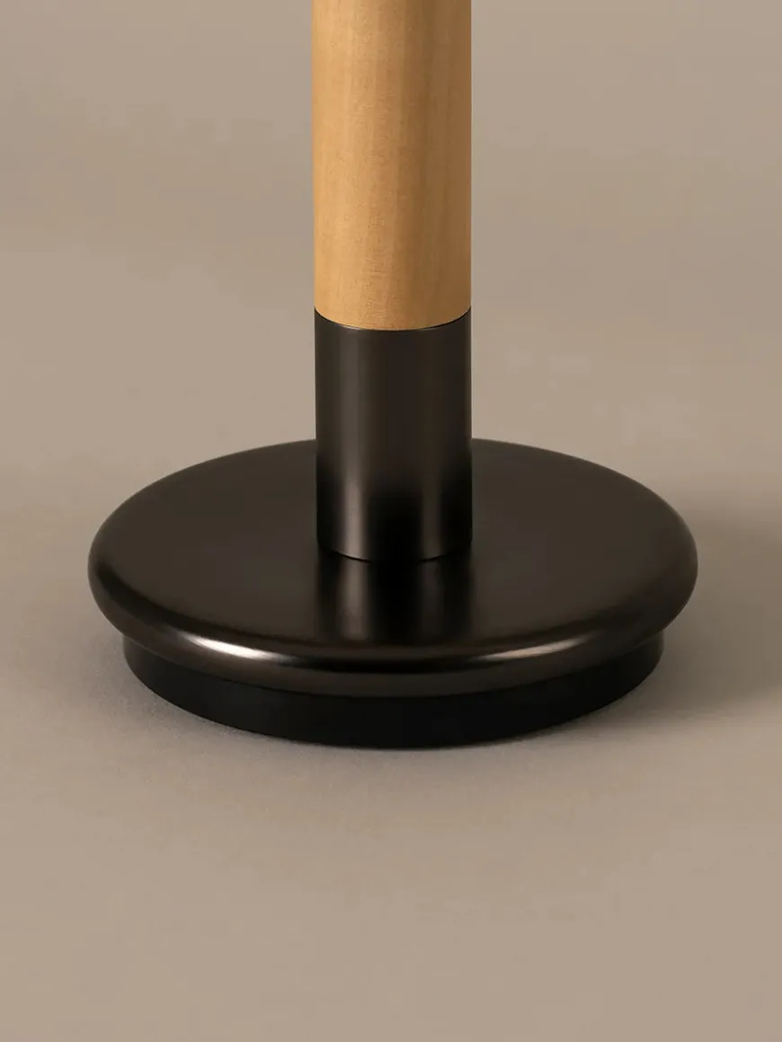 Básica Mínima Batería er den bærbare version af . Denne lette og praktiske lampe er lavet af birketræ og en metalbase med bronze finish. Lampeskærmen fås i to forskellige versioner; pergament med syet detaljer og naturligt bånd, der er foldet.