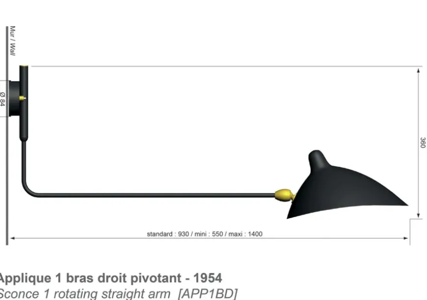 Big Wall Lamp w/1 Rotating Straight Arm af Serge Mouille