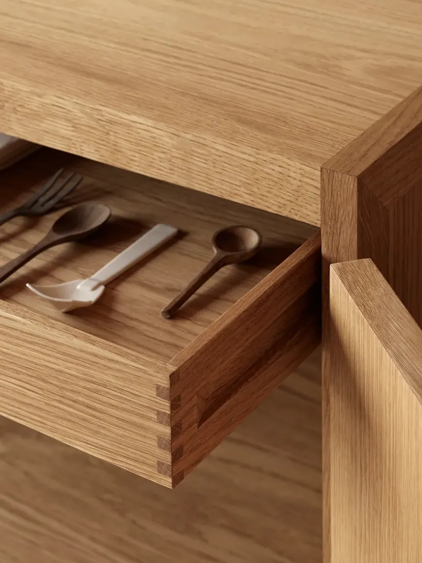 BM0057 er fremstillet i FSC-certificeret eg med elegante messing detaljer og er et resultat af avancerede snedkerteknikker. Bag skænkens dobbelte foldelåger findes der to flytbare hylder og to skuffer, der er smukt udformet med fokus på både æstetik og praktisk anvendelse. Der er plads til at opbevare service til 12 personer i skænken.