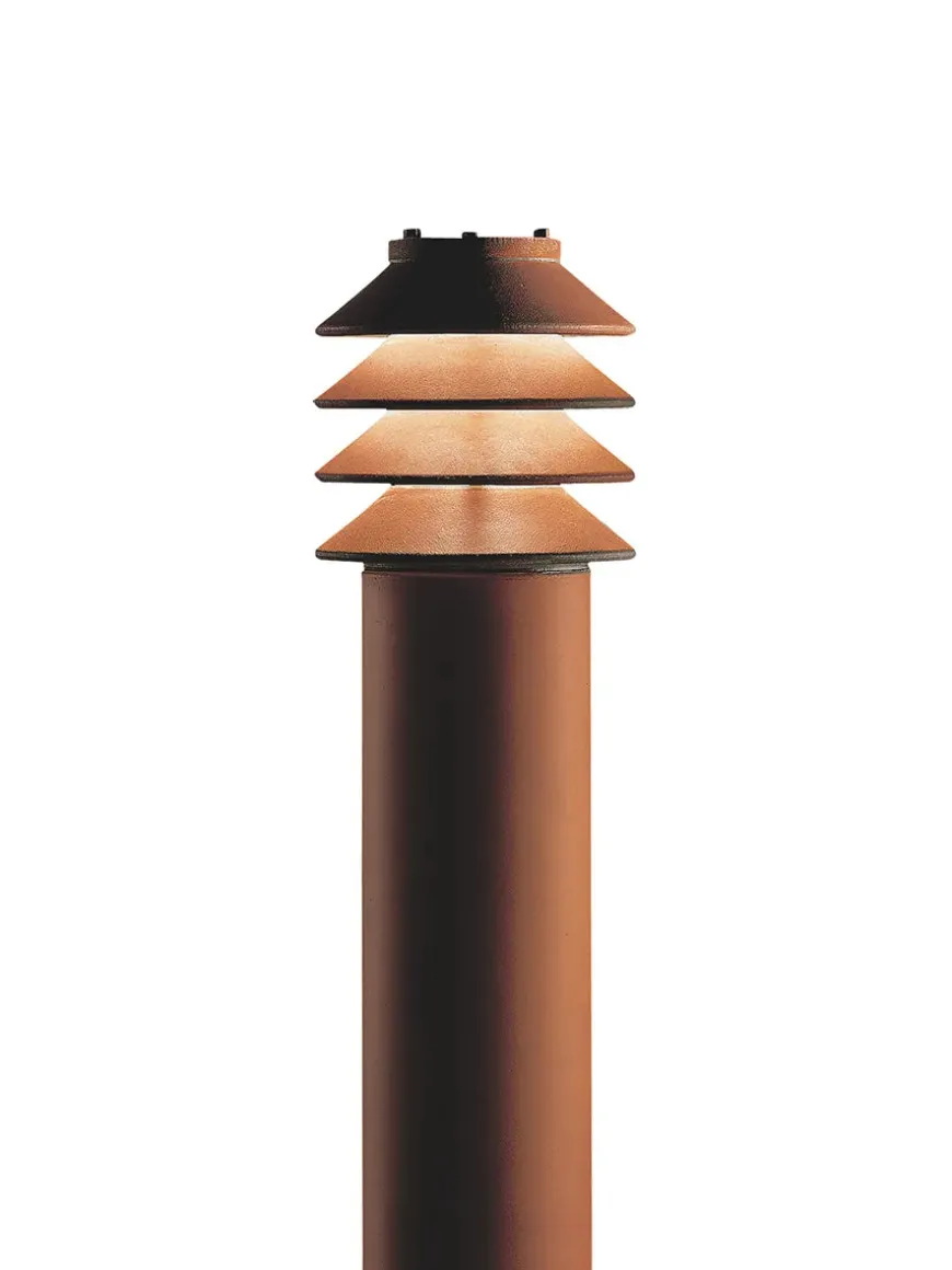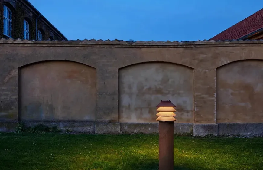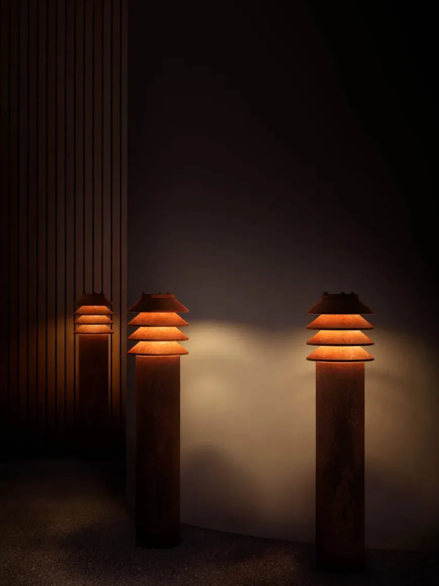 Bysted Pullert er en smuk udendørslampe i cortenstål fra Louis Poulsen. Armaturet udsender et nedadrettet lys. Lamellerne er hvidlakerede på indersiden for bedre at reflektere lyset, og der dannes et markant lysmønster symmetrisk omkring armaturet.