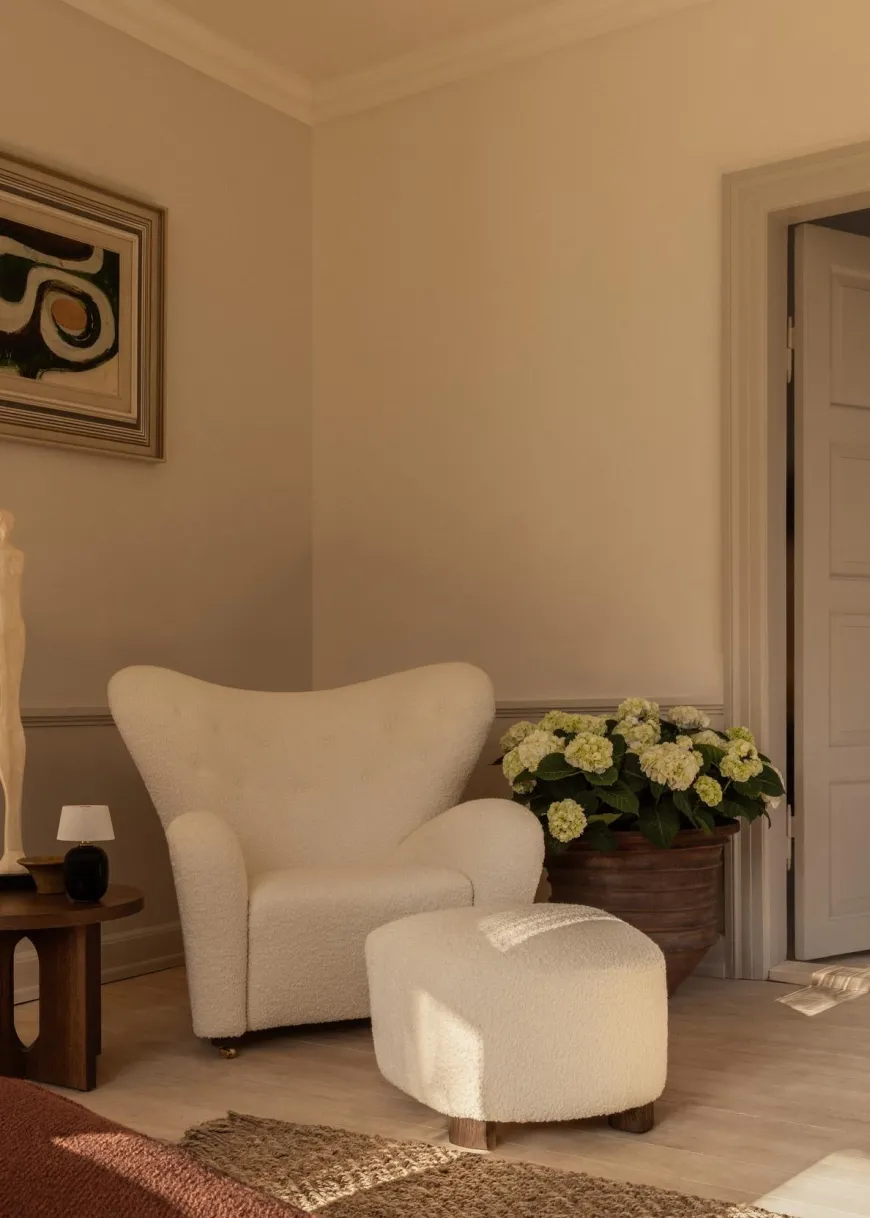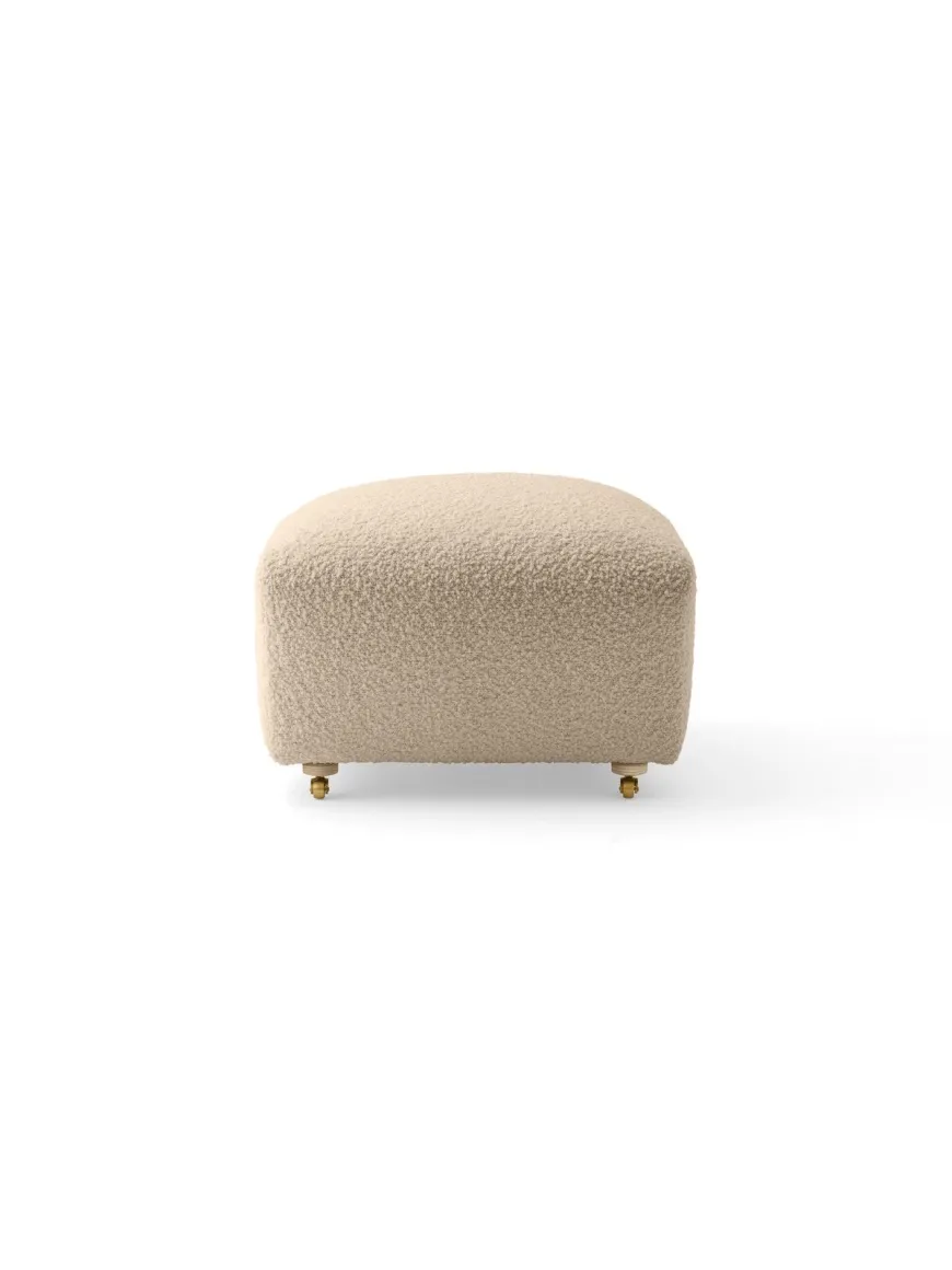 Den originale fodskammel til Den Trætte Mand – her i Baena 15, en lys beige bouclé fra Limonta, der giver en rolig, varm tekstur og matcher lænestolen perfekt. Vælg ben i eg eller mørkbejdset eg; de forreste messinghjul gør den let at flytte og tilfører en diskret, eksklusiv detalje. Brug den foran stolen, som ekstra siddeplads eller som lille sidebord med en bakke.