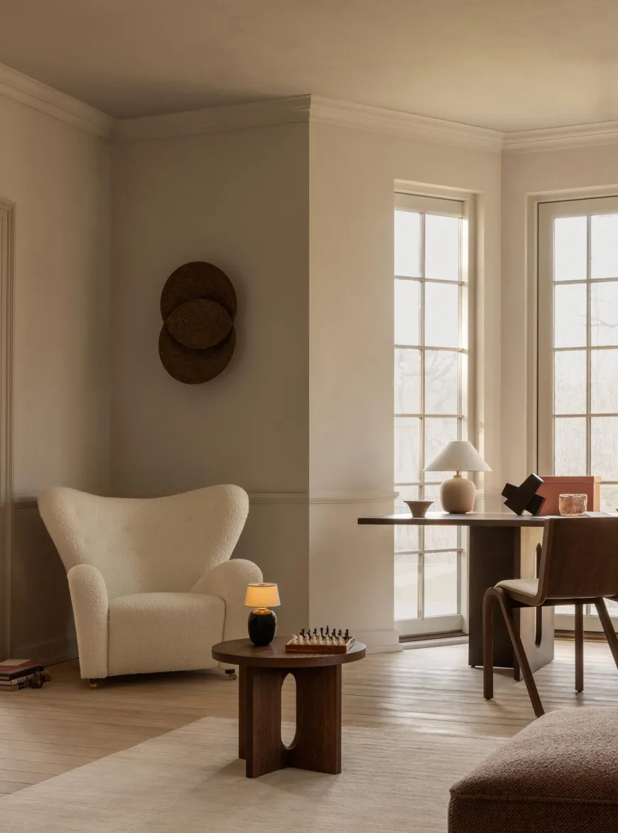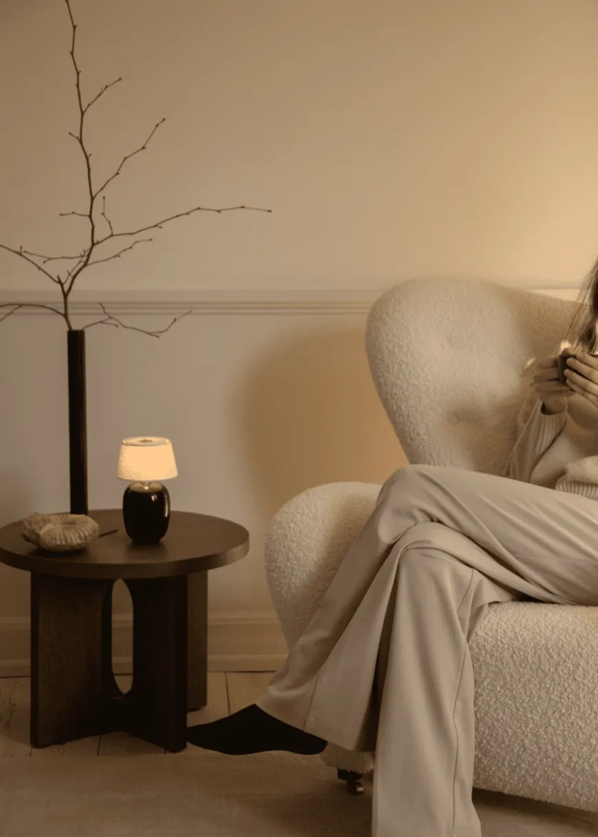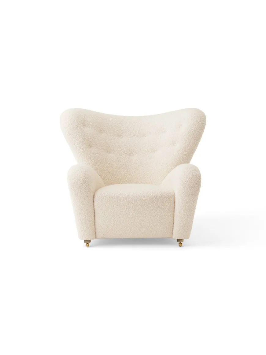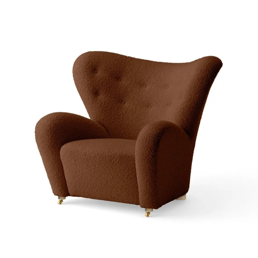 Den Trætte Mand i Baena 15 (lys beige bouclé) er Audo Copenhagens poetiske opdatering af Flemming Lassens klassiker. Den runde, “vingede” form omslutter kroppen, mens den taktile bouclé giver rolig varme til indretningen. Vælg ben i eg for et lyst, naturligt udtryk – eller mørkbejdset eg for en skarp, grafisk kontrast. Med forreste messinghjul, generøse mål og mulighed for matchende ottoman er dette et tidløst statement-piece skabt til hverdagsluksus i stuen, læsehjørnet eller soveværelset.