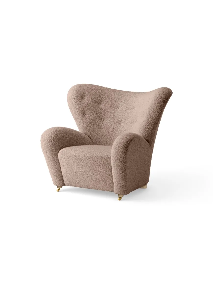 Ro, tyngde og tekstur i perfekt balance. Den Trætte Mand polstret i Baena 95 fremstår markant og varm – en tæt, taktil bouclé i en brunlig nuance, der giver stolen et roligt, sofistikeret udtryk. De generøse kurver og det let “vingede” ryglæn inviterer til lange læsestunder, mens du kan vælge ben i eg eller mørkbejdset eg for at fuldende looket og matche stolen med stilen i dit hjem. Foran afsluttes udtrykket med hjul i messing, som gør stolen nem at trille på plads.