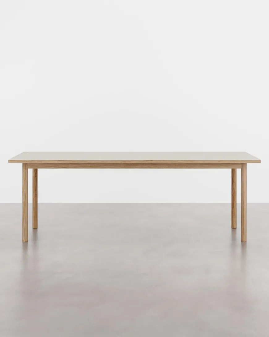 ESSENTIAL OAK i Mushroom er designet til at skabe ro omkring borddækningen. Den matte linoleumsoverflade har en blød, svampetonet nuance der balancerer mellem varm beige og grå og gør plads til både hverdagsmad og weekendgæster. Egens naturlige åretegning indrammer pladen og understreger den enkle geometri. Med længde på 140 centimeter og bredde på 90 centimeter får du et format der føles rummeligt uden at dominere mindre spisezoner. Proportionerne giver stabilitet og et let udtryk på samme tid, og den lakerede træfinish er valgt for at gøre pleje og rengøring ligetil. Linoleum er et naturligt materiale baseret på linolie og harpiks som dæmper genskin og føles behageligt at røre ved. Sammensætningen af taktile materialer og rolige farver gør bordet let at style med både lyse træsorter tekstiler i uld og keramik med struktur, så spisemiljøet får et samlet og tidløst præg.