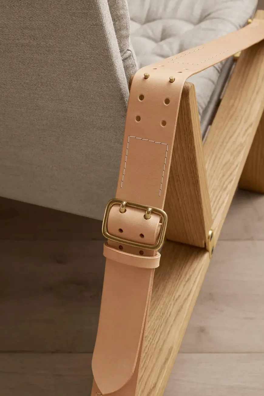 Materiale: – Egetræ (olieret/hvidolieret) – Natur kanvas – Kernelæder – Messing – Sort pulverlakeret stål