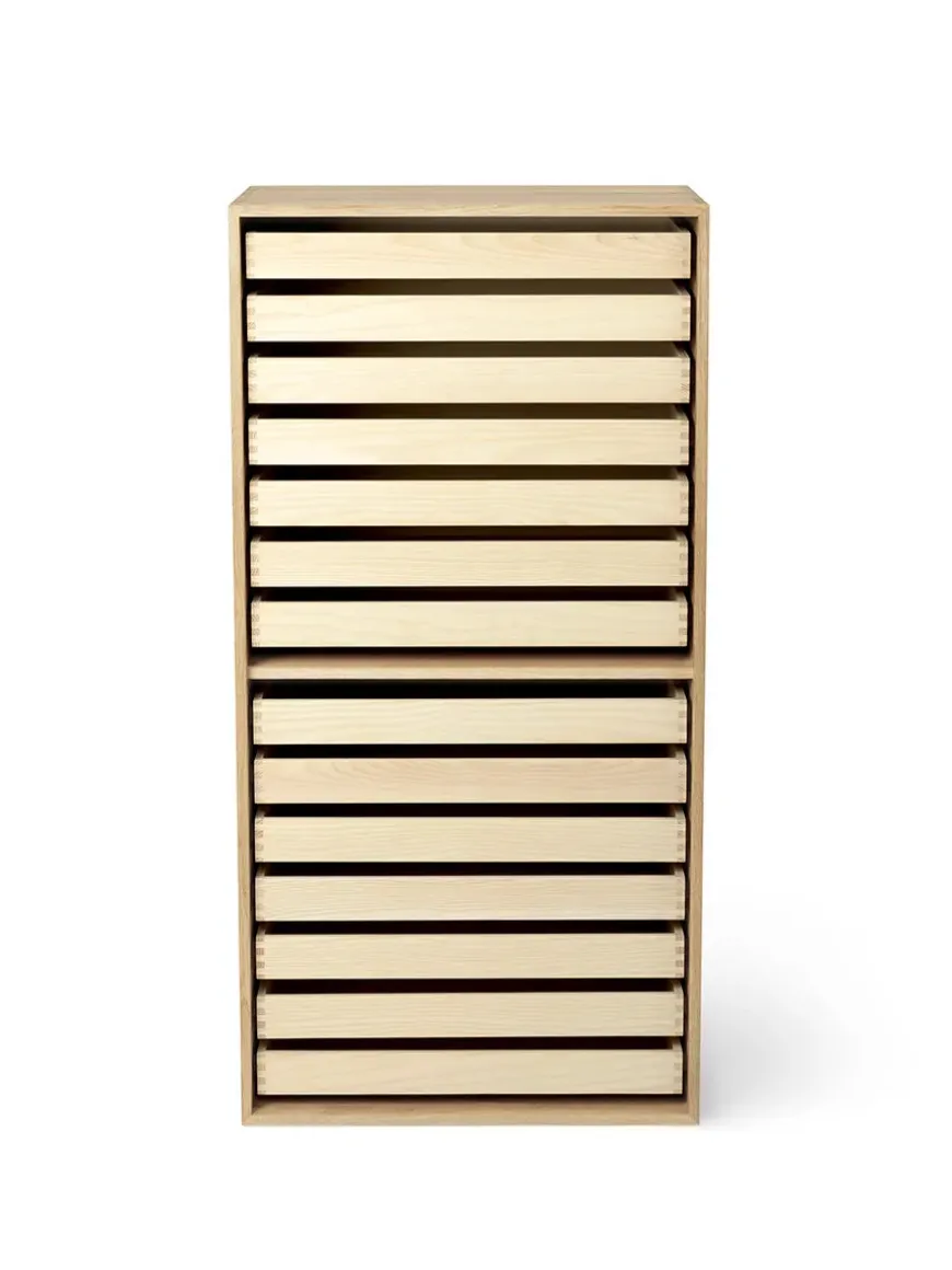 FK63 Bookcase System FK63 skabet fra Carl Hansen & Søn er tegnet af Preben Fabricius og Jørgen Kastholm i 1963 og er et særpræget møbel til ethvert rum. FK63 kabinettet hviler her på et slankt stel i pulverlakeret stål. Bemærk: Der er ingen hylder eller bakker bag lågerne. Ønskes dette, skal reolen tegnes med hylder eller bakker inden bestilling.