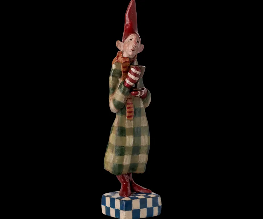 Et Maileg samleobjekt. Hvert år designer de en ny unik nisse. Denne smukke figur er formet i hånden og bagefter håndmalet. Hver figur har sit eget unikke udtryk og er pakket i en gaveæske. Her er det en fin nisse med en lille gris i hånden.
