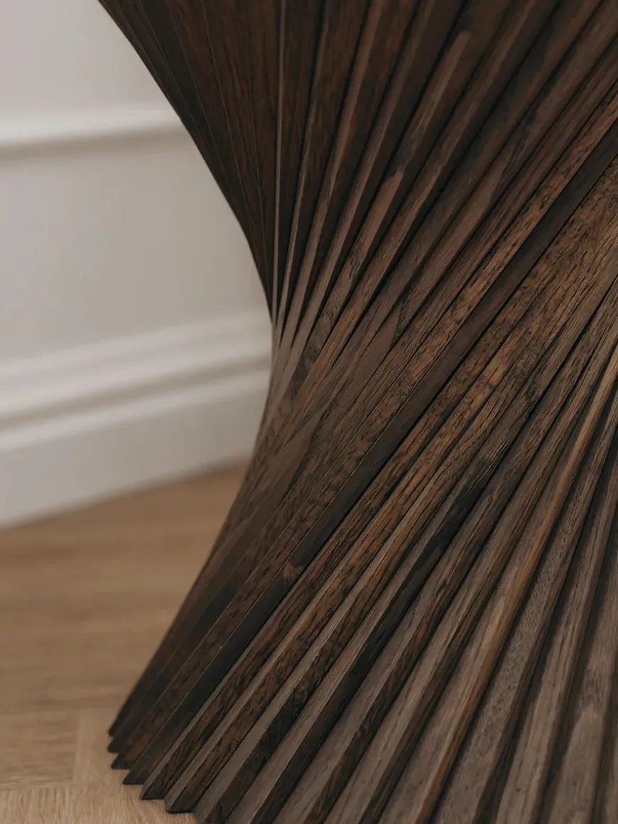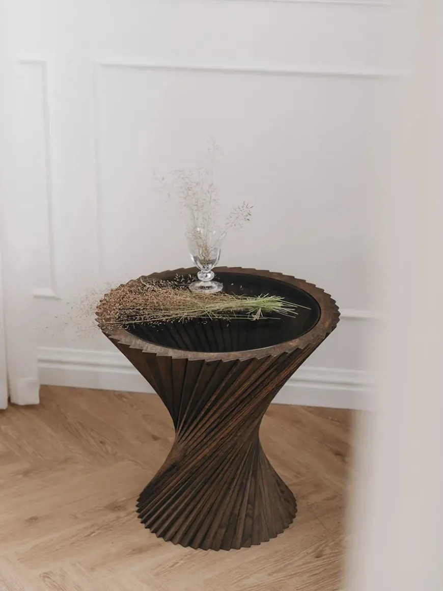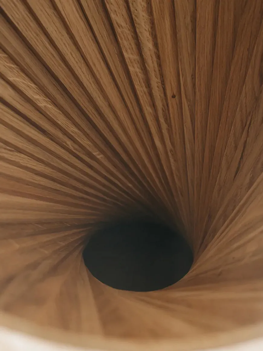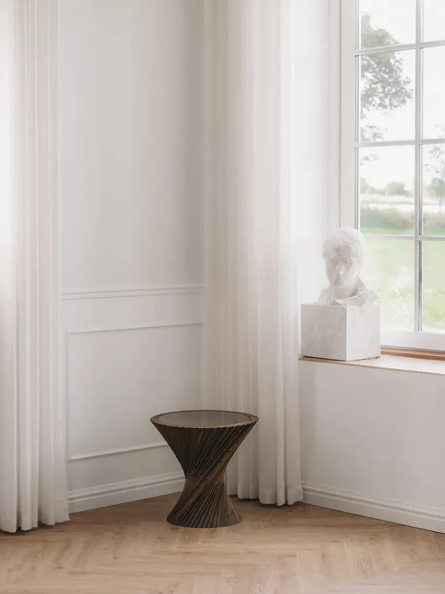 HYPERBEL sidebordet i lys eg fra VIA Copenhagen bringer et lyst og luftigt greb på den skulpturelle signaturform. De præcist udførte lameller samler sig i et elegant svaj, så bordet får en levende silhuet der skifter karakter efter lyset i rummet. Den hvidolierede eg giver et moderne, nordisk udtryk med tydelig årestruktur, mens den klare glasplade lader øjet følge konstruktionen hele vejen ned. Resultatet er et sidebord der både fungerer som praktisk afsæt og som et roligt blikfang ved sofaen i entréen eller som piedestal for kunst og planter. Hver detalje er forarbejdet i Danmark af erfarne håndværkere og de 48 lameller i certificeret eg vidner om høj præcision og lang holdbarhed. Den matte topcoat gør overfladen behagelig at røre ved og robust i daglig brug. Hyperbel er nem at placere alene eller i par og tilfører lethed og kvalitet til både moderne og klassiske indretninger.