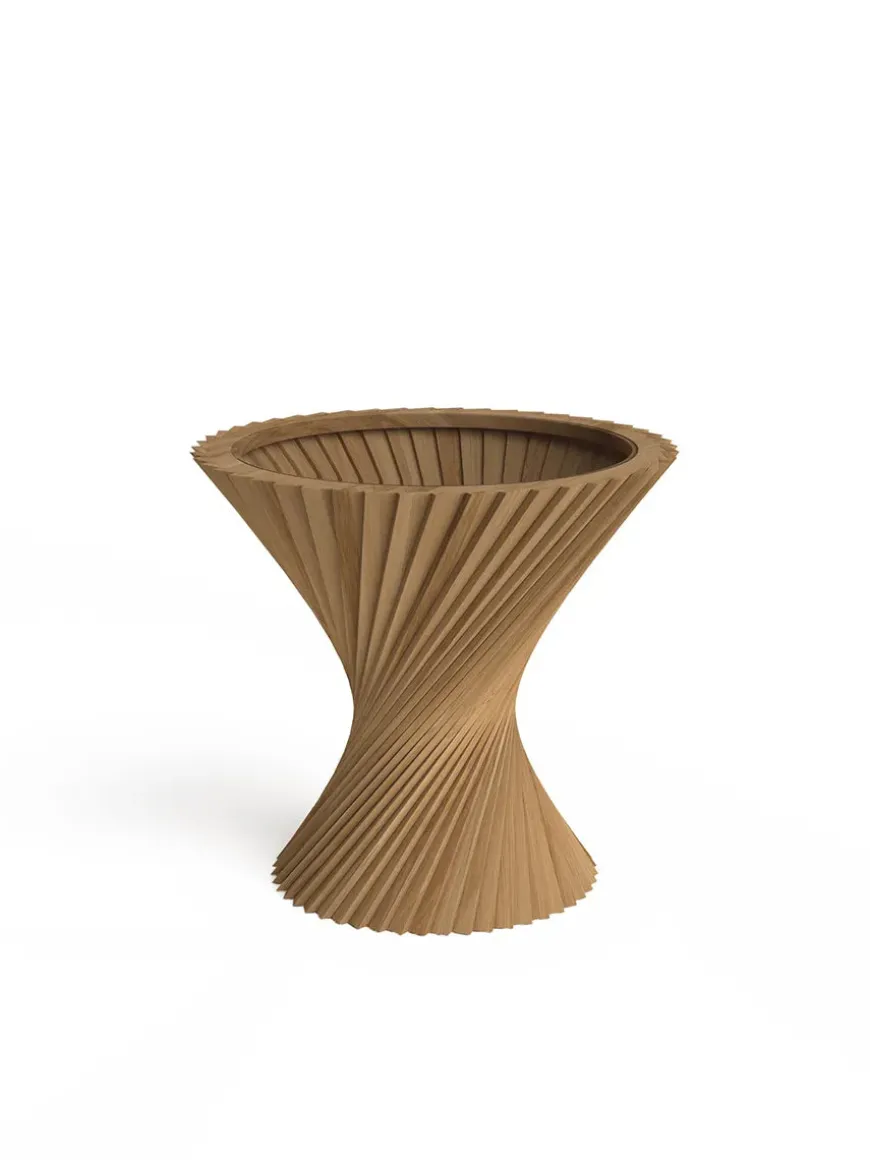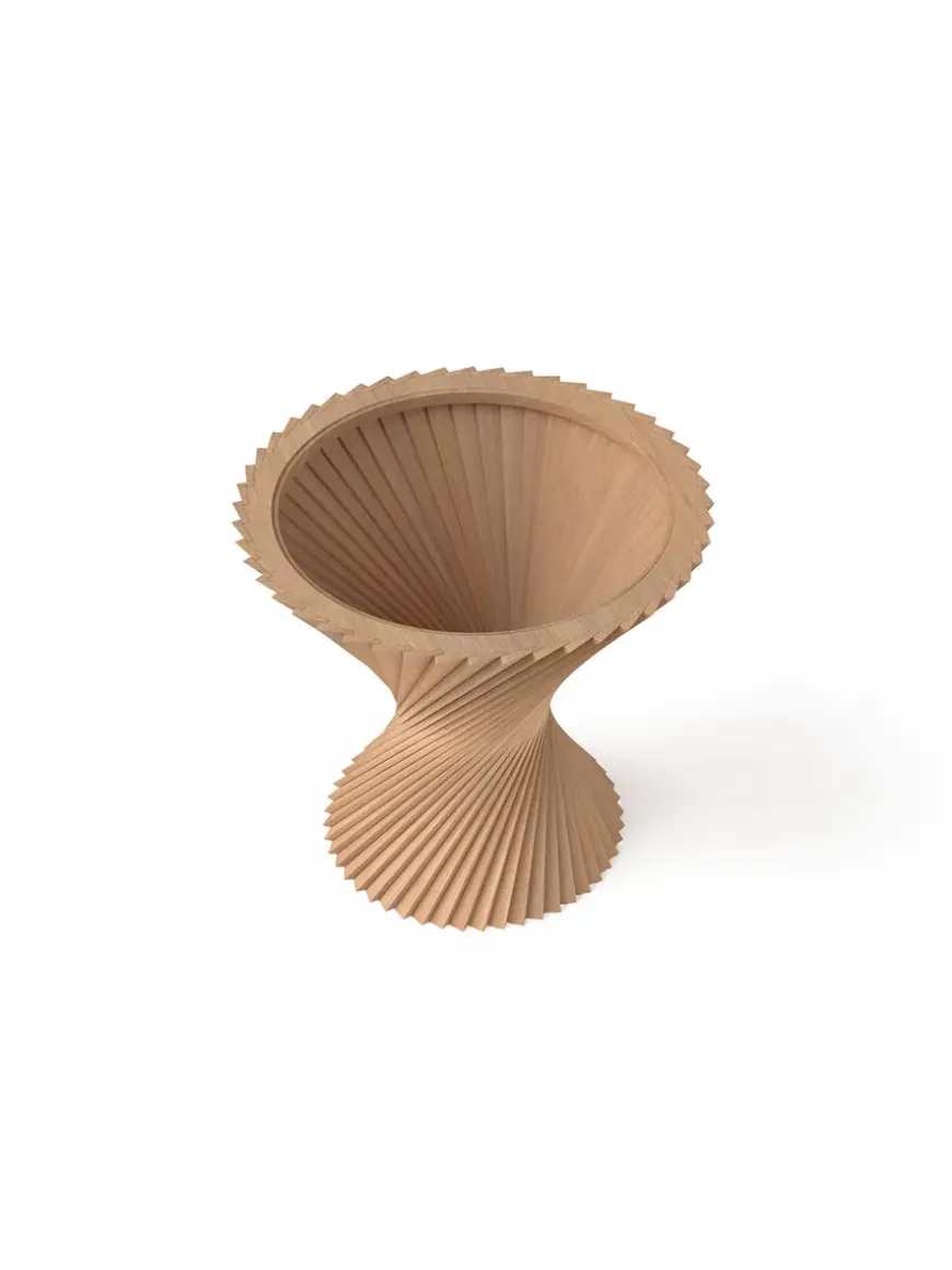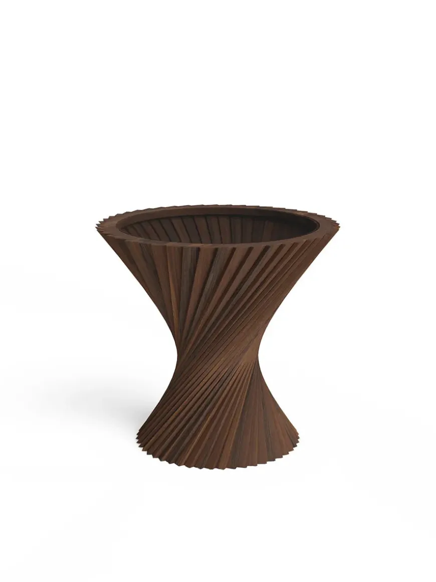 HYPERBEL sidebordet fra VIA Copenhagen er et lille stykke skulptur til stuen. Den karakterfulde form er bygget op af 48 præcist formede lameller i certificeret eg, der snor sig mod midten og giver bordet en elegant timeglasvirkning. I røget eg får træet en dyb og sofistikeret tone, som skaber et roligt men markant fokuspunkt ved sofaen, som fritstående piedestal eller i gangen. Den bronzetonede glasplade hviler let på konstruktionen og lader blikket passere ned gennem lamellerne, så håndværket træder tydeligt frem. Overfladen er olieret med en mat lakforsegling der gør træet behageligt at røre ved og modstandsdygtigt i hverdagen. Hyperbel er produceret i Danmark af erfarne snedkere med sans for materialer og lang holdbarhed. Resultatet er et sidebord der forener kunstnerisk udtryk med funktionel anvendelighed i et tidløst design der er let at placere i både moderne og klassiske rum.