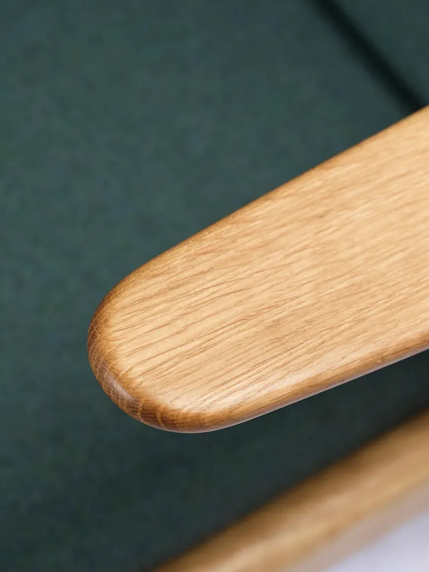 Lænestolen har hynder i fire forskellige farver, og stel i olieret egetræ.