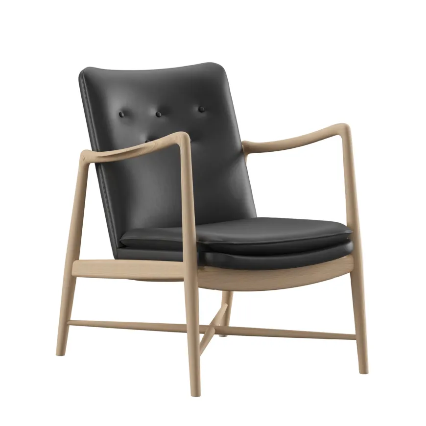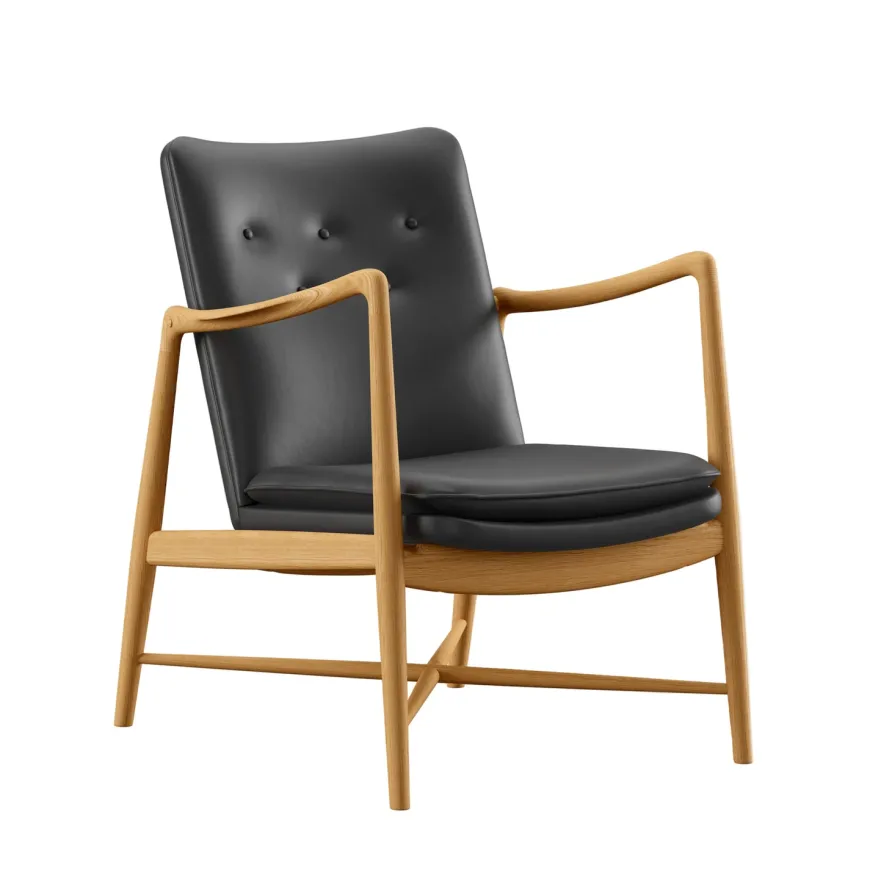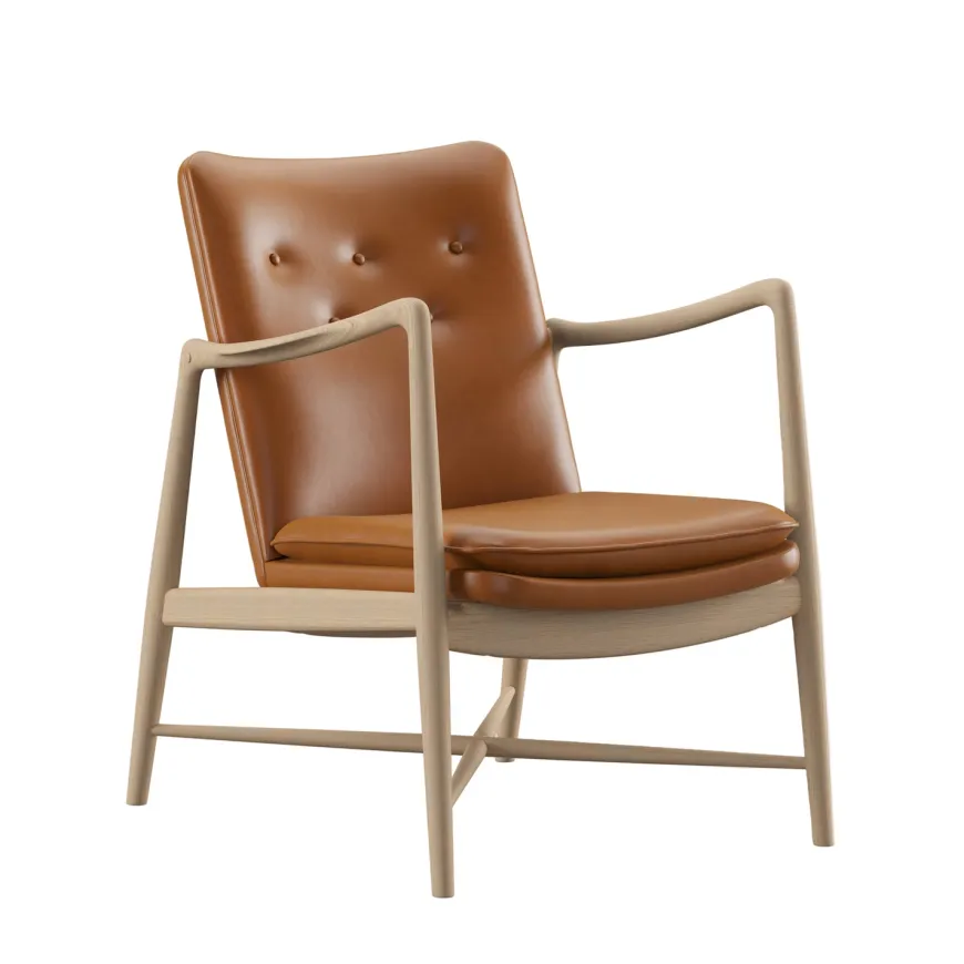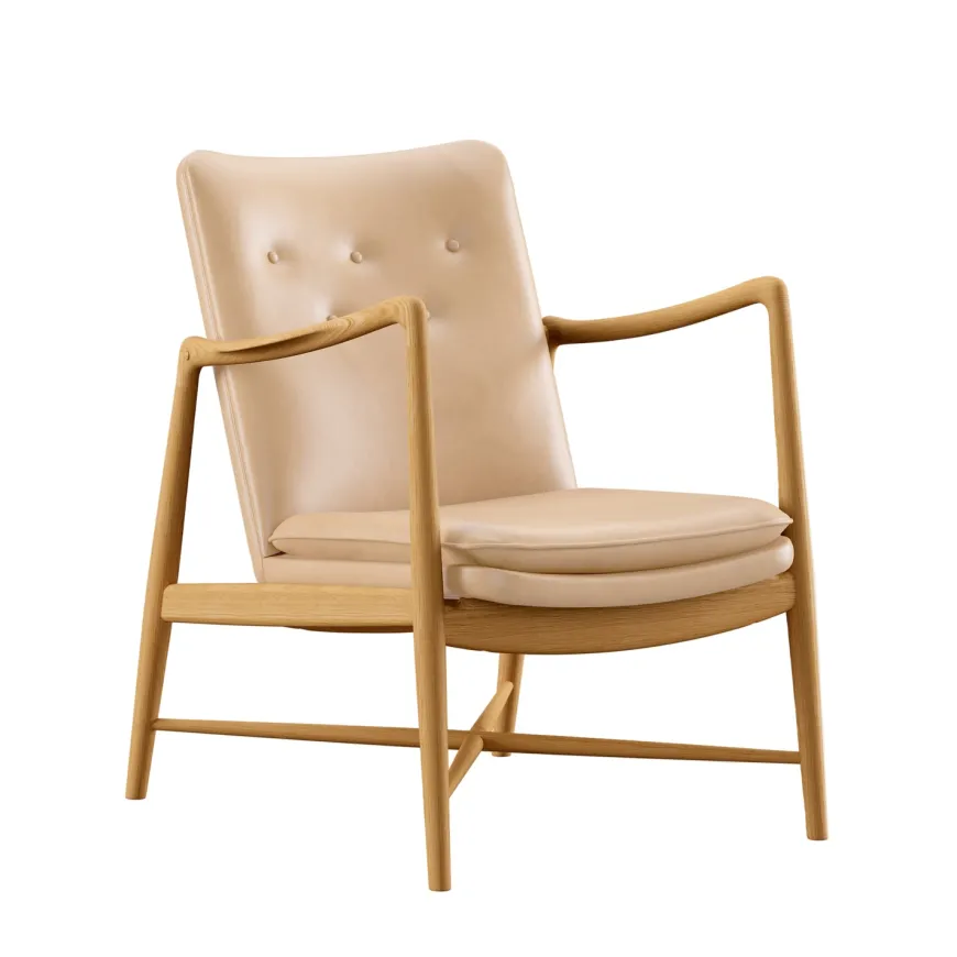 Fireplace Chair indfanger essensen af Finn Juhls organiske formsprog og inviterer til rolige stunder ved ildens skær. De svungne armlæn og den elegante krydsdetalje mellem benene giver stolen et let og skulpturelt udtryk, mens den generøse polstring leverer blød komfort uden at virke tung. Hver stol fremstilles med stor omhu, håndpolstret i Danmark i læder eller tekstil og båret af et massivt træstel i ask eg eller valnød. Resultatet er en tidløs lænestol der passer naturligt ind i både klassiske og moderne interiører og som med sin åbne silhuet bliver et varmt samlingspunkt i stuen.