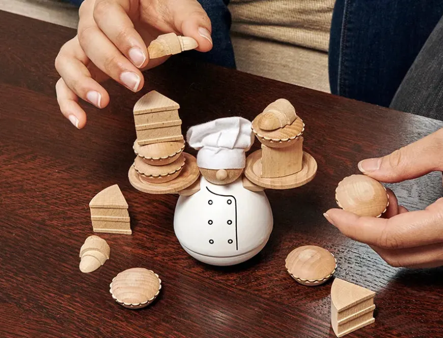 Kikkerland Balance The Baker er et spil, der tester din balanceevne. I dette spil skal du stable tærter, kager og croissanter, men pas på ikke at vælte det ned eller vælte bageren!