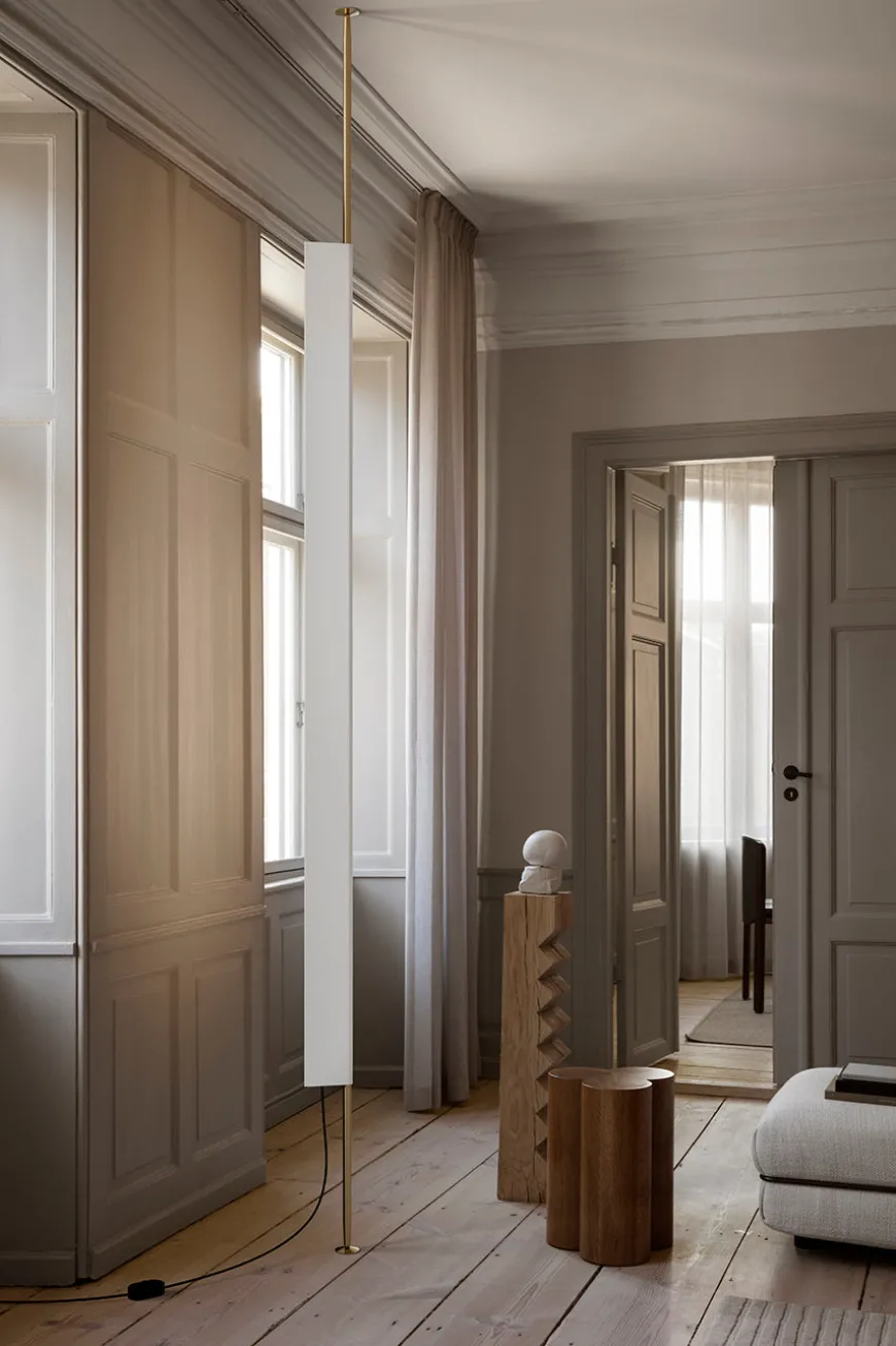 Den indbyggede LED-lyskilde er elegant skjult under den ekstruderede aluminiumsstruktur, som kan justeres i enhver vinkel, så lyset let kan tilpasses rummets stemning og behov. De slanke ben i naturmessing tilføjer et eksklusivt og skulpturelt udtryk.