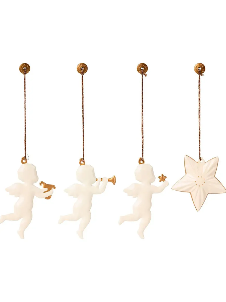 En perfekt gaveæske, der indeholder 4 smukke Maileg ornamenter. Hvert ornament er pakket ind i silkepapir og pakket i en gaveæske dekoreret med Dorthe Mailils tegninger. Dette sæt indeholder 3 forskellige engle og en stjerne.