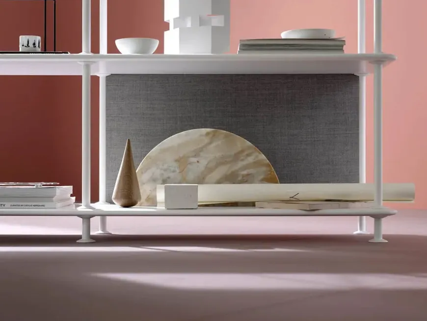 Montana Free reolsystemet er opbygget af lakerede MDF-hylder i dybde 38 adskilt af tynde stager i krom, der giver et let og svævende udtryk og understreger de horisontale hylder.