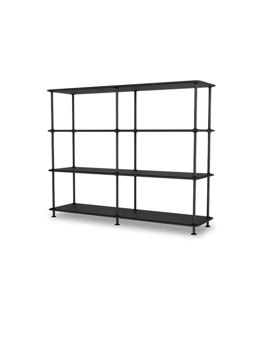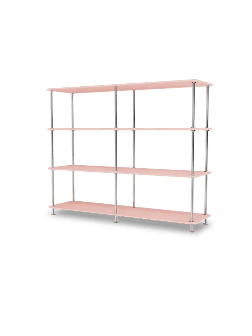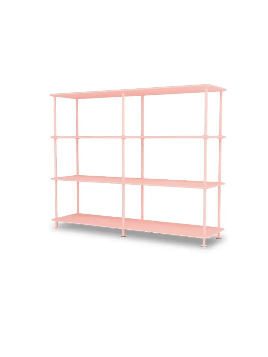 Montana Free reolsystemet er opbygget af lakerede MDF-hylder i dybde 38 adskilt af tynde stager, der giver et let og svævende udtryk og understreger de horisontale hylder.