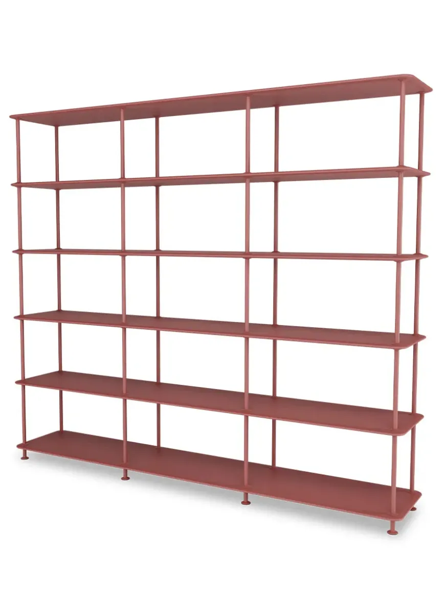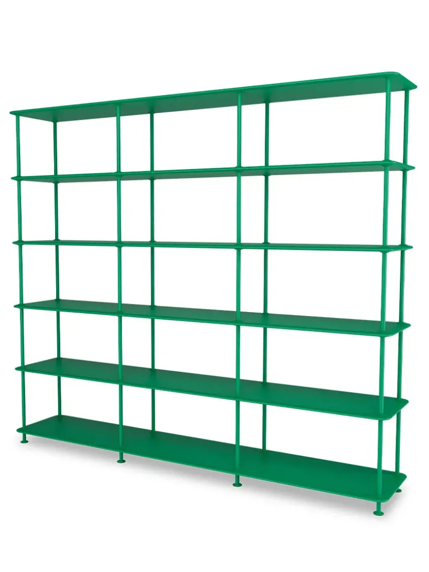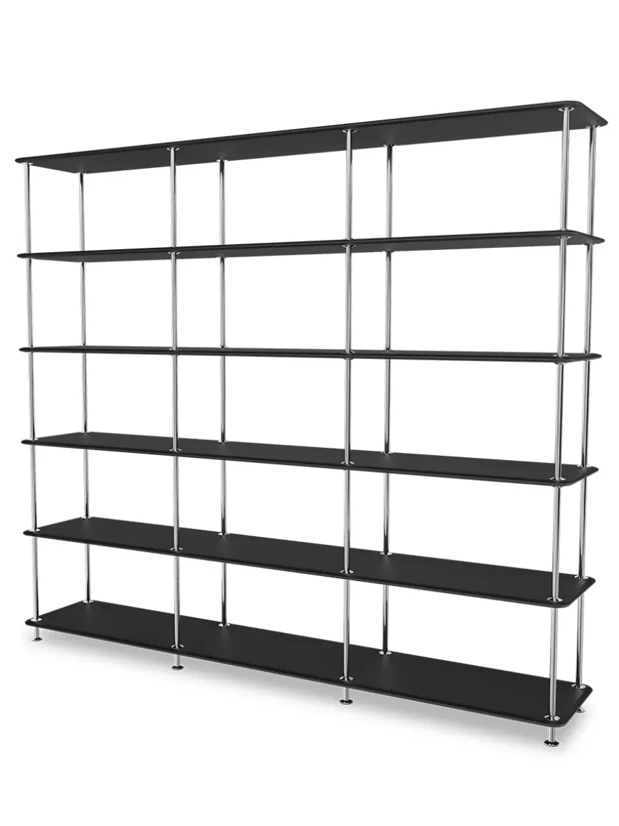 Montana Free reolsystemet er opbygget af lakerede MDF-hylder i dybde 38 adskilt af tynde stager i krom, der giver et let og svævende udtryk og understreger de horisontale hylder.