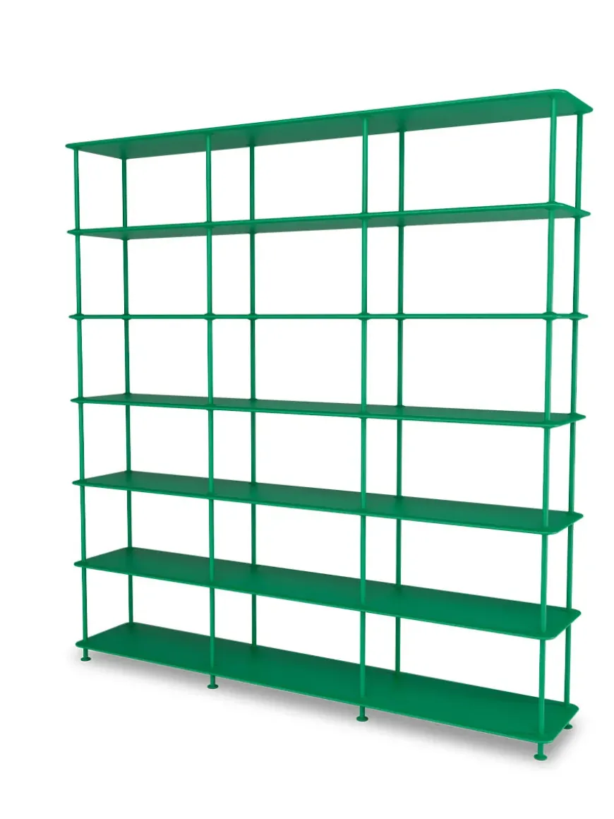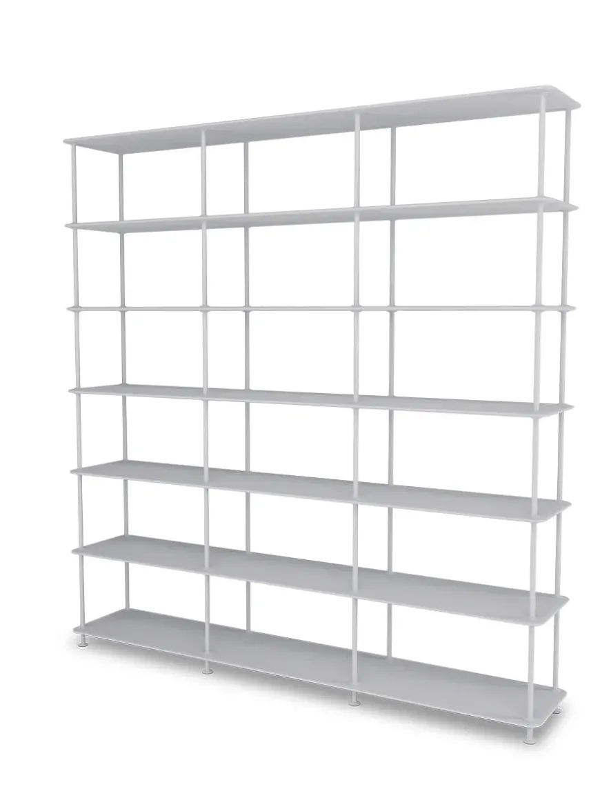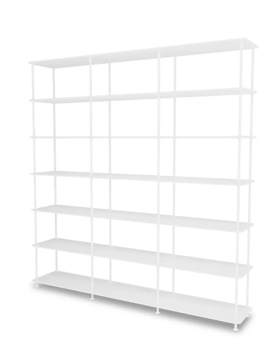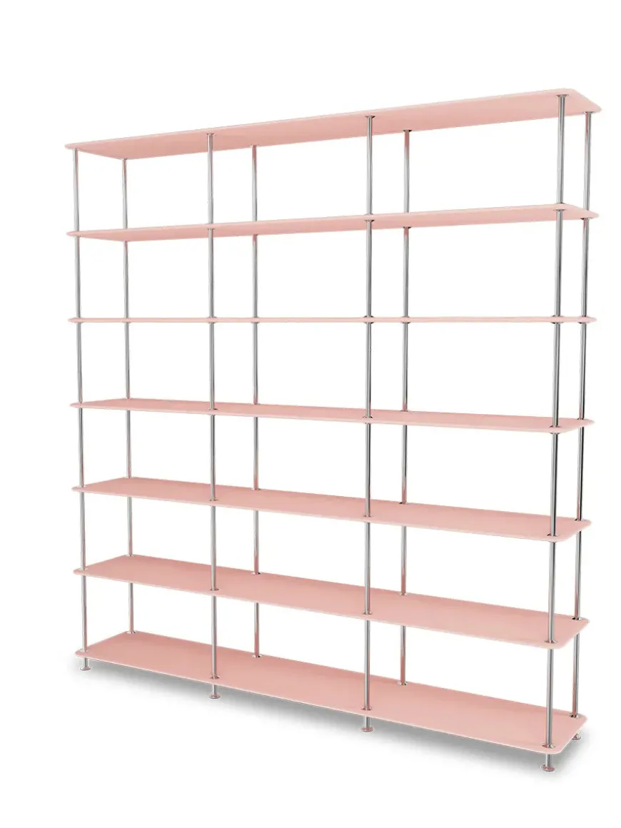 Montana Free reolsystemet er opbygget af lakerede MDF-hylder i dybde 38 adskilt af tynde stager i krom, der giver et let og svævende udtryk og understreger de horisontale hylder.