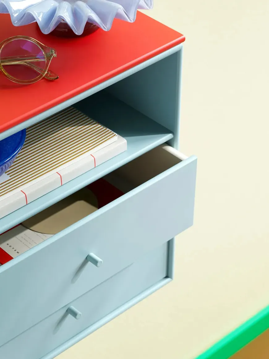 Montana Mini er en serie med mindre opbevaringsmoduler, som laves i 10 forskellige farver. Her finder du modulet med to rum og en skuffe nederst, som giver gode muligheder for opbevaring af diverse ting, eksempelvis i soveværelset, entréen eller stuen. Serien laves af 8 millimeter MDF modsat de 12 millimeter, som resten af Montanas reoler. Ophæng medfølger.