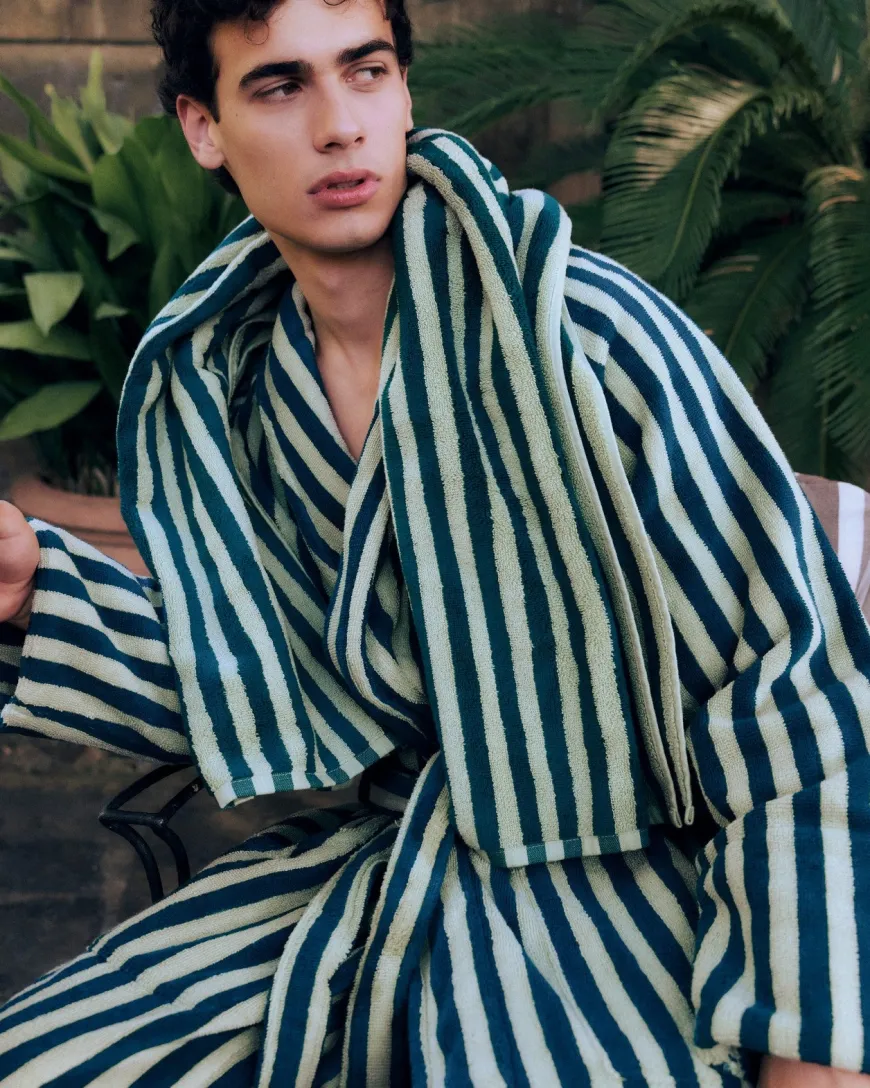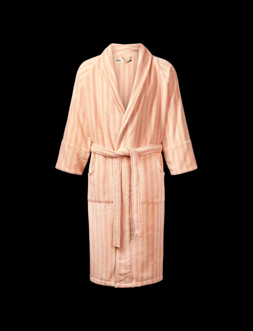 Indhyld dig i blød komfort med Naram badekåben fra Bongusta i Tropical & Creme – en stribet klassiker med sjalkrave, bindebælte og to rummelige lommer, skabt til langsomme morgener, efter badet eller en dukkert. Vævet i 100% kæmmet, OEKO-TEX®-certificeret bomuldsfrotté i en fyldig 385 g/m²-kvalitet, der både absorberer effektivt og føles silkeblød mod huden. Naram er håndlavet i Indien og har en generøs, indhyllende pasform, der giver god bevægelsesfrihed. Fås i S/M (ca. 122 cm) og L/XL (ca. 138 cm); vælg L/XL, hvis du er over 176 cm eller foretrækker et oversized look. For at bevare blødheden anbefales vask ved 40°C med lignende farver – gerne før første brug.