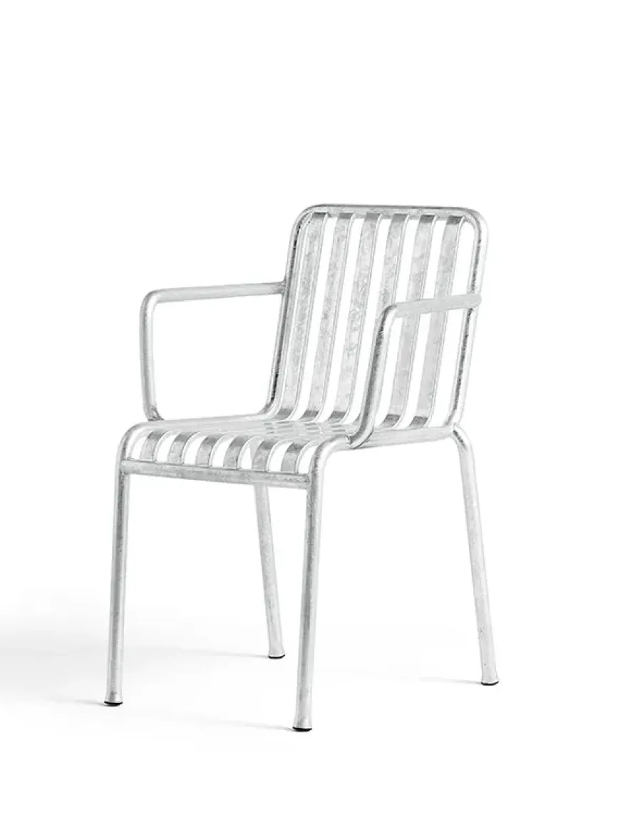 Den smukke Palissade stol med armlæn. Havestolen laves i farverne olive, sky grey, anthracite eller hot galvanised. Brug evt. stolen på terrassen eller i haven sammen med de smukke Palissade borde, som du kan se nedenfor.