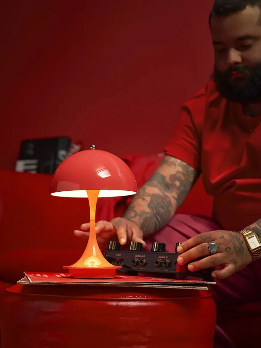 Panthella Portable er en lille, charmerende og ledningsfri lampe, som kan tages med rundt i hjemmet og oplades med USB-C-kabel.