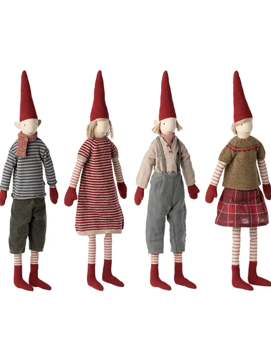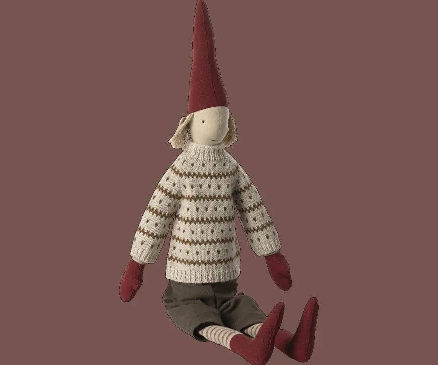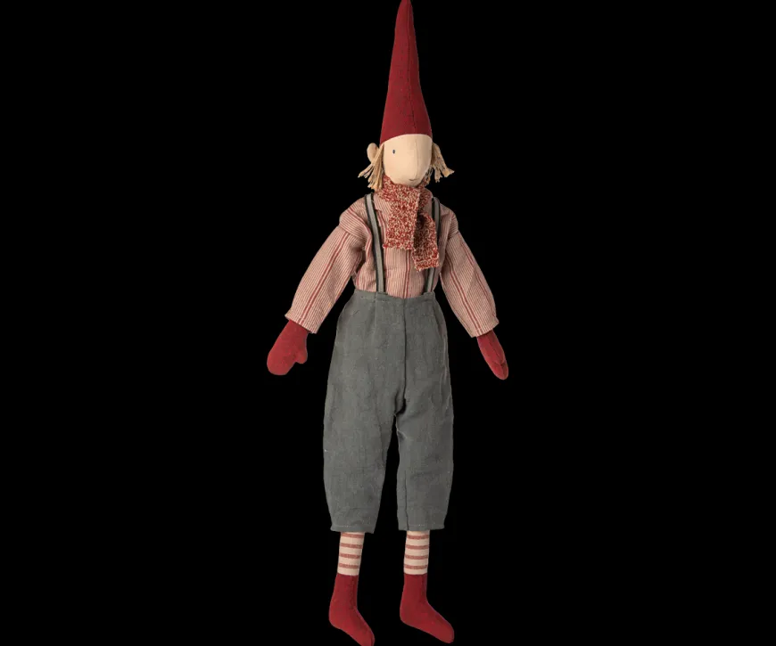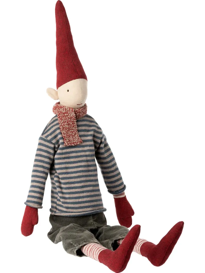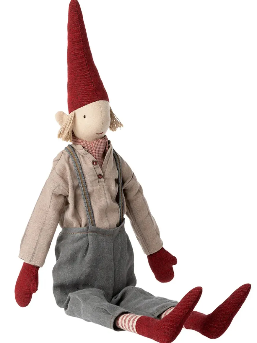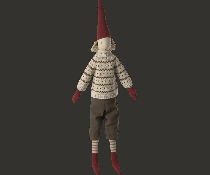 Mailegs Pixy-nisser er ikoniske julefigurer, der bringer hygge og tradition ind i hjemmet. Denne Pixy i størrelse 4 er en dreng iført skjorte og bukser – et klassisk outfit, der giver ham et tidløst og nostalgisk udtryk. Med sin højde på ca. 60 cm er han en markant figur, perfekt til at placere i entréen, ved juletræet eller som en del af en større juleopstilling. Figuren er fremstillet i bløde tekstiler med fine håndlavede detaljer, hvilket gør hver Pixy unik. En dekorativ samlerfigur, der kan bringes frem år efter år som en fast del af julens pynt.