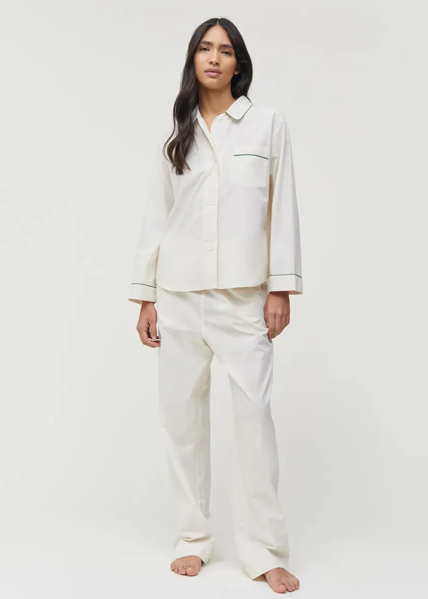 Et to-delt natsæt med skjorte og bukser. Skjorten har en fin v-udskæring og bukserne er med løse, lige ben og med elastik i livet. Hop i den fine pyjamas, når du skal slappe af hjemme.