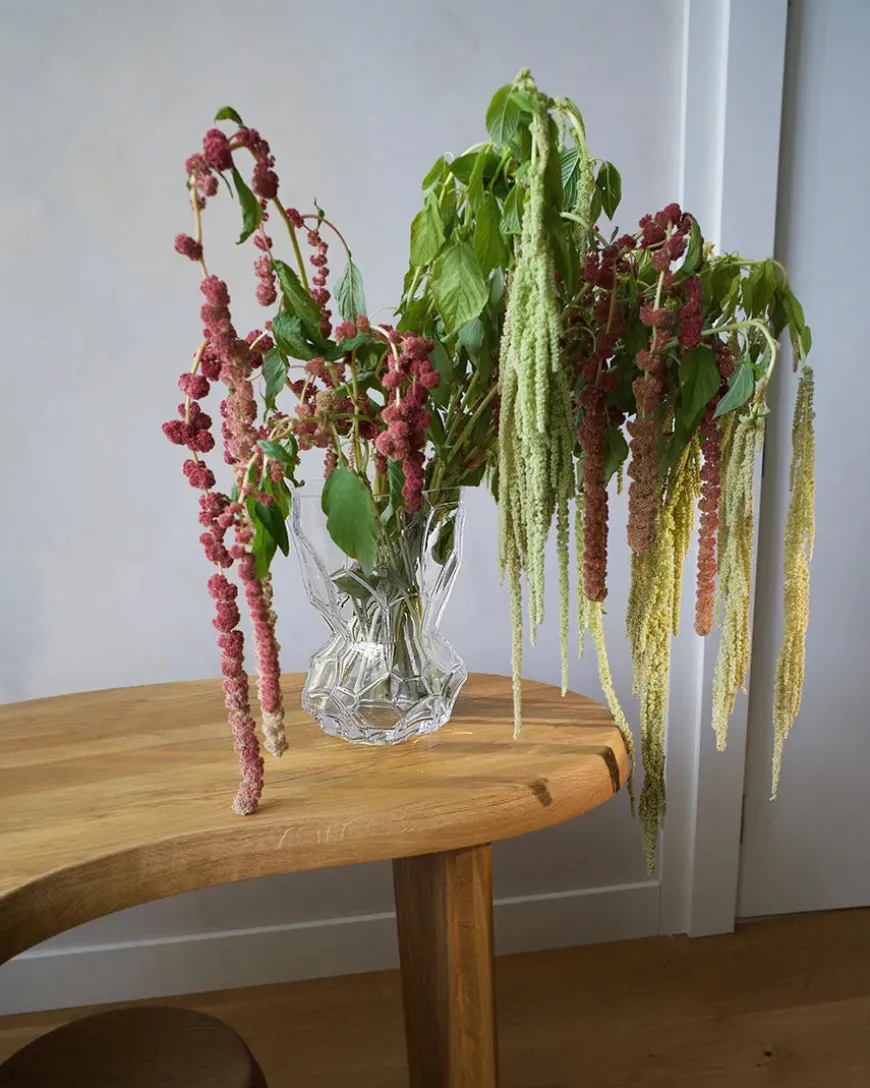 Reflection vasen fra Hein Studio er inspireret af iskolde schweiziske bjergfloder. Isen på floderne ses tydeligt i vasens design. Reflection vasen er mundblæst og af ét stort stykke gas. Vasen er flot både med og uden blomster og er et smukt element at bruge på spisebordet. Her er vasen i et smukt metallisk glas, der giver en skøn afspejling.