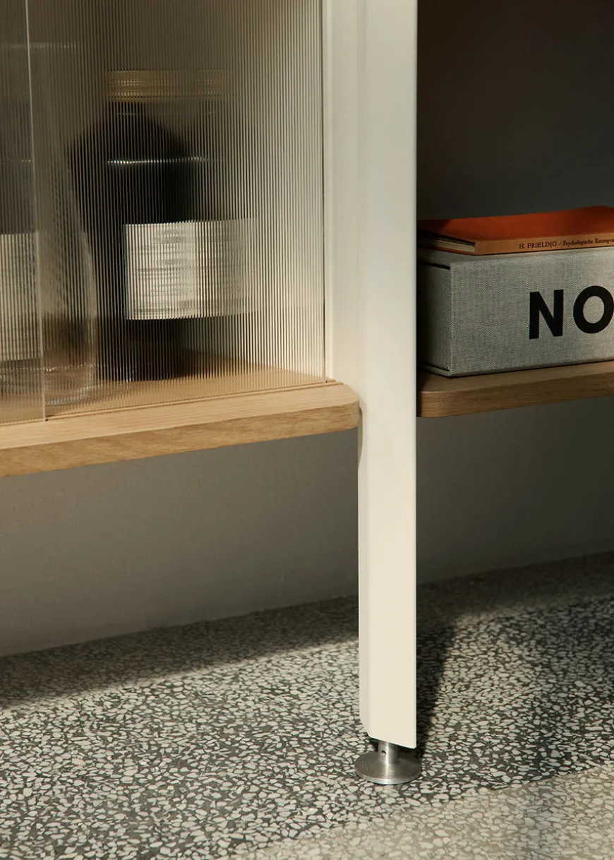 Rombe konfiguration D består af Rombe IF3 og IF5, som dermed består af både hylder, en skriveplade og et skab med riflede glaslåger. Fås med hylder i enten alabaster, eg, anthracite eller valnød. Resultatet er en harmonisk løsning, hvor åbne hylder og skjult opbevaring supplerer hinanden elegant.