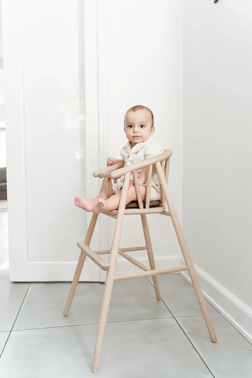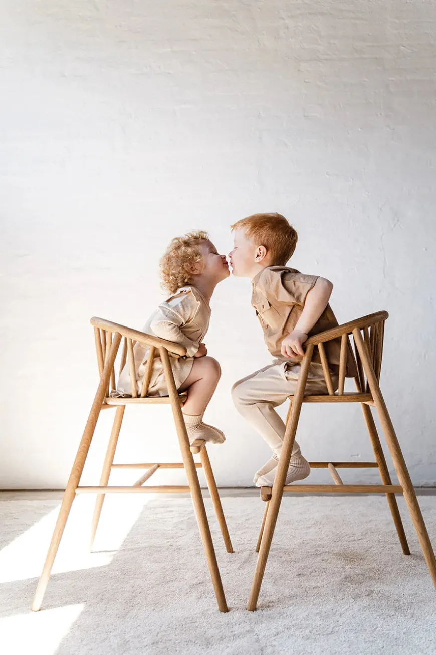 Saga højstolen fra Oaklings blev designet af Nina Bruun i 2021. Højstolen vil med sit tidløse og enkle udtryk smukt passe ind sammen med resten af hjemmets indretning. Den elegante højstol er en ny klassiker i hjemmet med små børn.