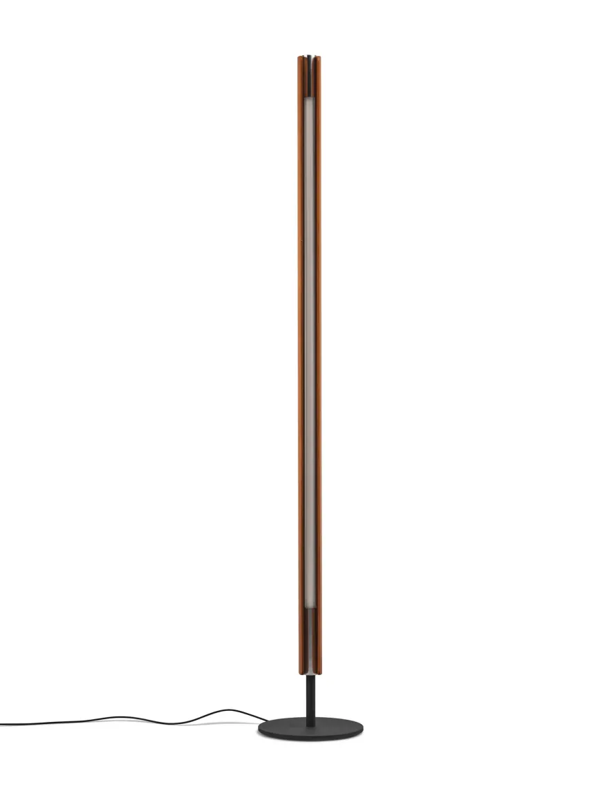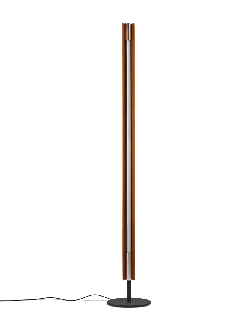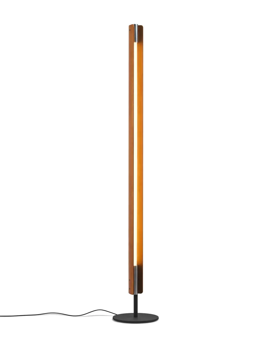 Seki-Han er Tobia Scarpas poetiske gulvlampe fra 1963 – relanceret af Flos med respekt for originalen. To roterende træblade i varmebehandlet ask omfavner et centralt LED-rør og lader dig åbne eller lukke lyset, fra blød vægvask til mere åben stemningsbelysning. Materialemødet mellem massivt træ, forkromede endestykker og en stabil, mat sort fod gør lampen skulpturel, også når den er slukket. Den integrerede LED (2700K, Ra90) leverer 2000 lumen og dæmpes elegant via foddæmper på ledningen. Hvert stykke træ er CNC-fræset i Norditalien og varmebehandlet for stabilitet – en tidløs klassiker, der tilfører varme, taktilitet og ro til moderne indretninger.