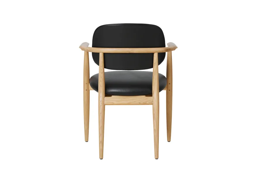 Med sit afrundede ryglæn og elegante læder- eller tekstilpolstring, udstråler stolen både ro og raffinement, perfekt til såvel private hjem som restauranter og mødelokaler.