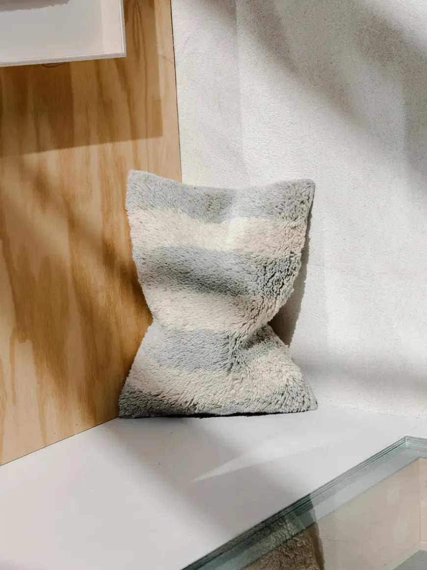 Stripe Nepal er en pude med masser af personlighed. Puden er håndvævet i Kathmandu af lokal tibetansk fåreuld, og bagsiden er af 100% GOTS-certificeret bomuld. Udført med vertikale striber i bløde, afdæmpede farver. Lukkes med overlappende stof, og bærer et håndbroderet Aiayu-logo på bagsiden.
