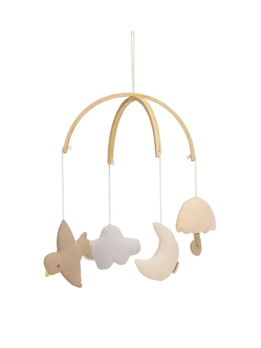 Inspireret af H.C. Andersens eventyr Ole Lukøje skaber denne uro en magisk stemning på børneværelset. De fire fine figurer – en sky, en måne, en fugl og en paraply – er omhyggeligt udformet for at symbolisere fredfyldt søvn og kærlige minder. Uroen er fremstillet af 100% økologisk bomuld. Den er designet til at hænge over vugger, tremmesenge og børnesenge, hvor dens blide bevægelser skaber en rolig atmosfære.