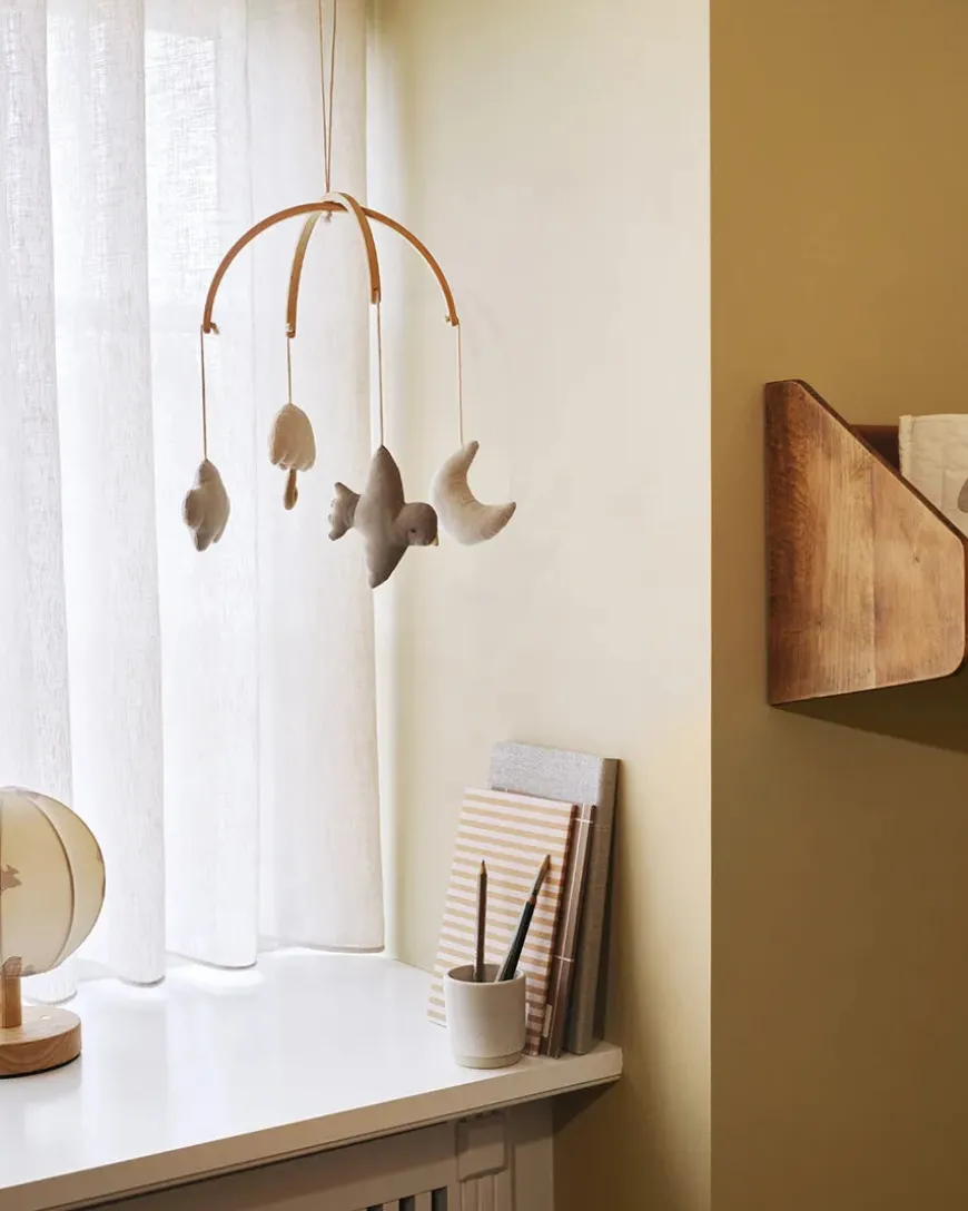 Med sit tidløse design passer den smukt ind i ethvert børneværelse. Uroen skal placeres uden for børns rækkevidde og skal fjernes fra sengen, så snart barnet kan sidde op.