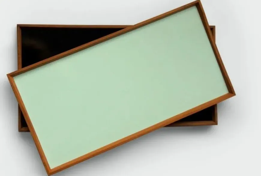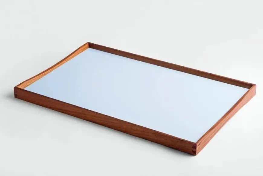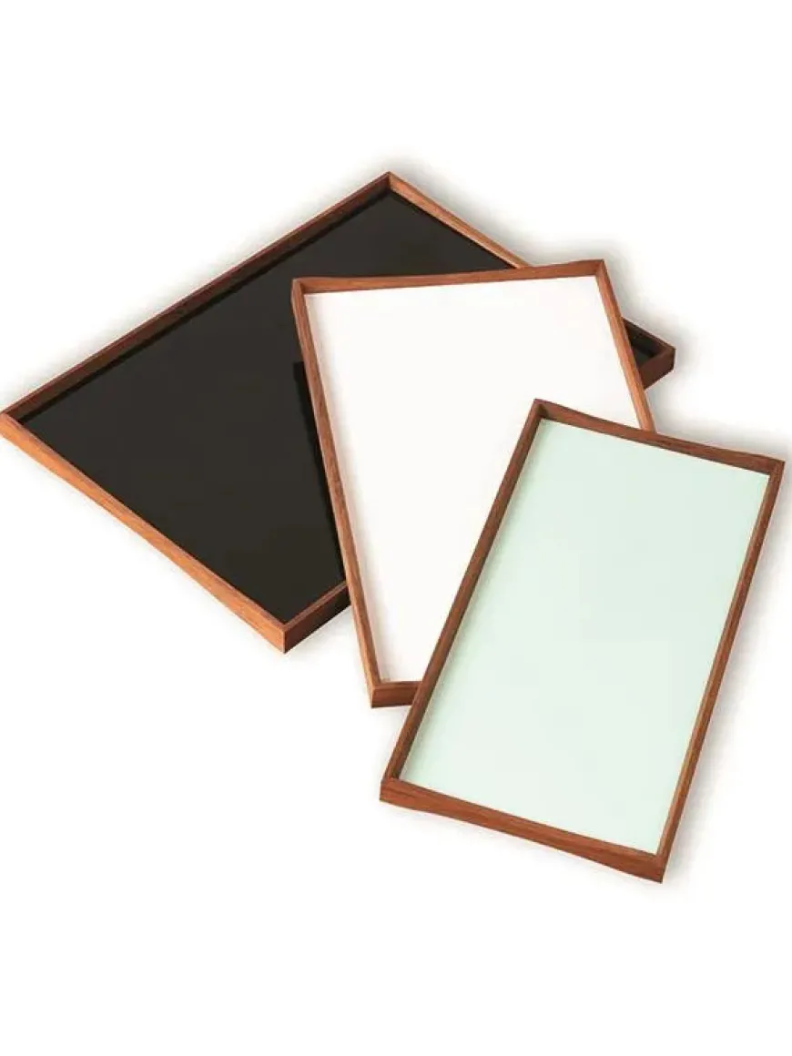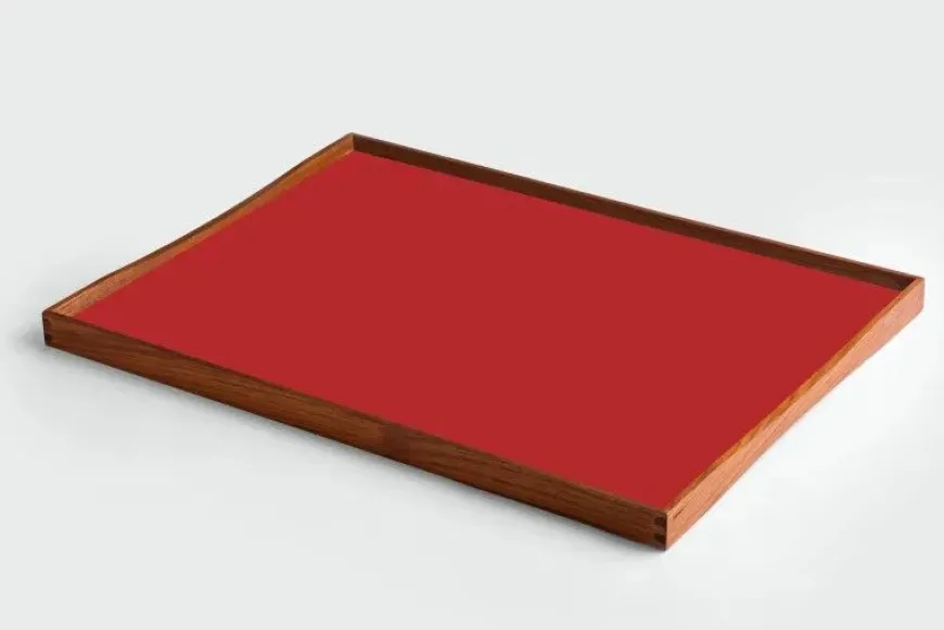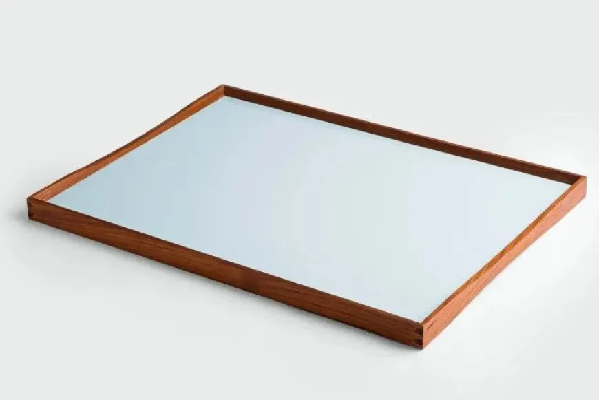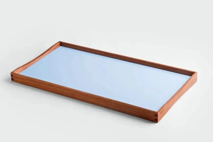 Turning Tray blev designet i 1956 af Finn Juhl og er fremstillet med den kurvede teaktræsramme og præcise hjørnesamlinger, der er blevet hans varemærke. Bakken er uden håndtag, men dens kurver gør, at der er plads til at alle størrelser hænder, fra børn til voksne, kan løfte den. Turning Tray er, som navnet antyder, tosidet med blanke laminatsider, der holdes sammen af den smukke teaktræsramme.