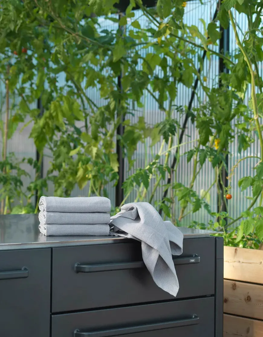 Vipp viskestykker til køkkenet er vævet i tofarvet økologisk bomuld for at opnå den bedste kvalitet og absorberingsevne.