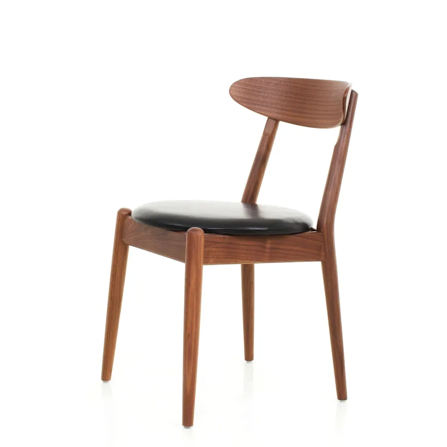Materiale: Massivt træ i valnød, ryglæn i fineret valnød, polstret sæde i sort læder
