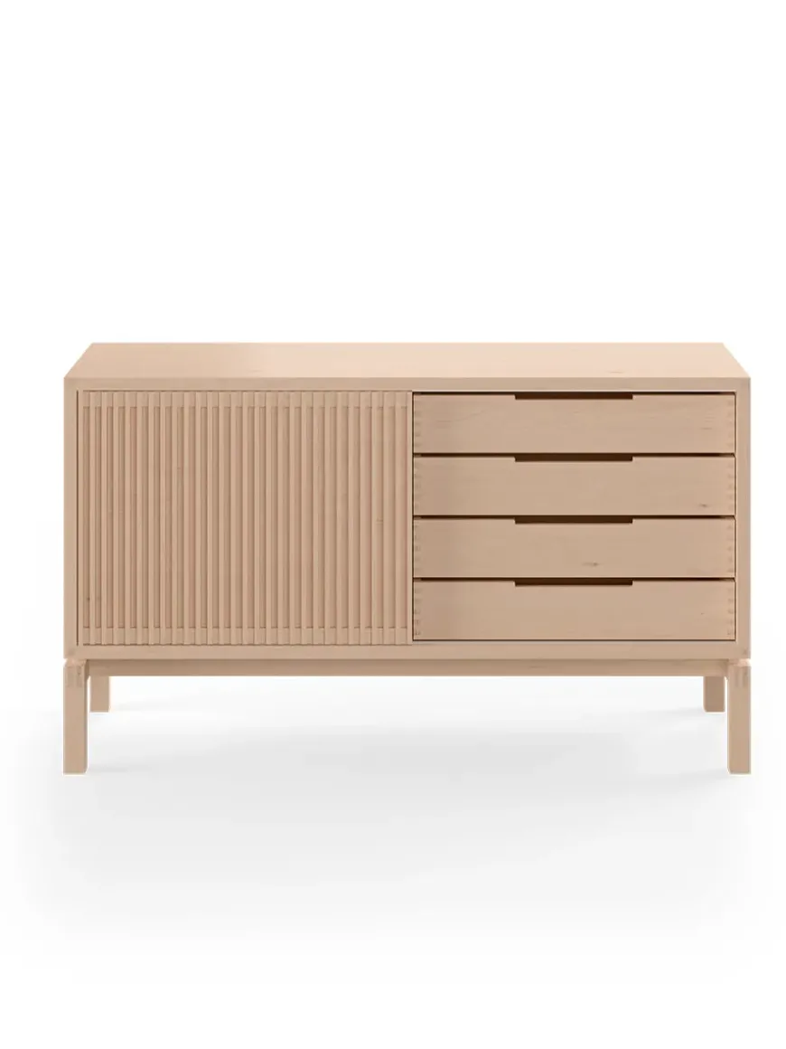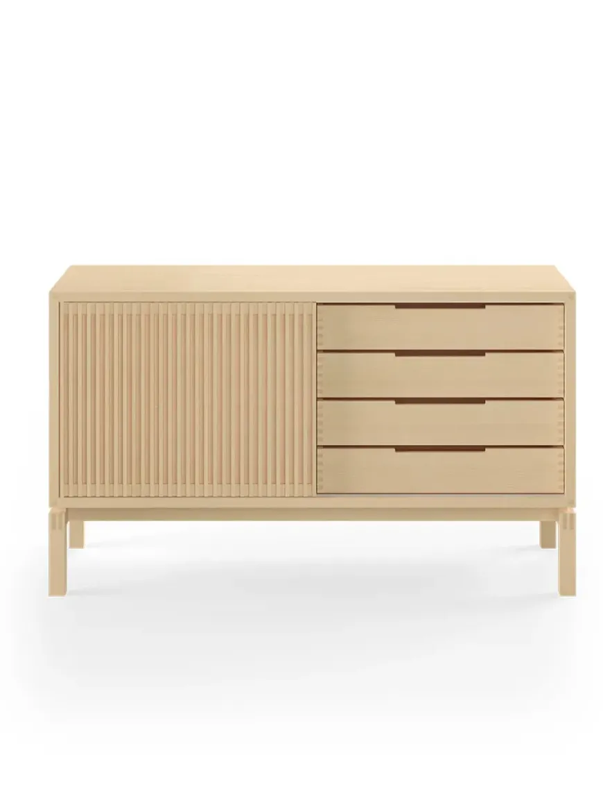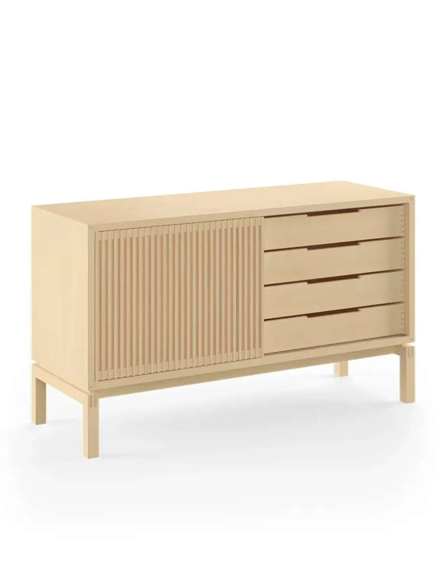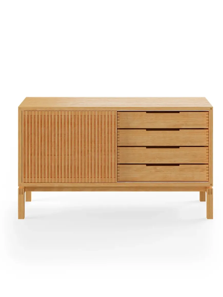 AK 2030 skænken er designet af Nissen & Gehl. Skænken er lille og med mange elegante håndværksmæssige detaljer. AK 2030 skænken er snedkereret på fineste vis, og det ses tydeligt, at der er lagt stor vægt på håndværket. Skænken har skydelåge med lameller og skuffer med tappede samlinger. Bag skydelågen er et åbent rum med en glashylde. Den smukke skænk fås også i en længere udgave, AK 2060, som ligeledes giver masser opbevaringsmuligheder. AK 2030 skænken fås i flere forskellige træsorter og behandlinger. Design: Nissen & Gehl Producent: Aksel Kjersgaard Mål: L 134 x D 48 x H 77,5 cm Vægt: 77 kg Materiale: Massivt træ