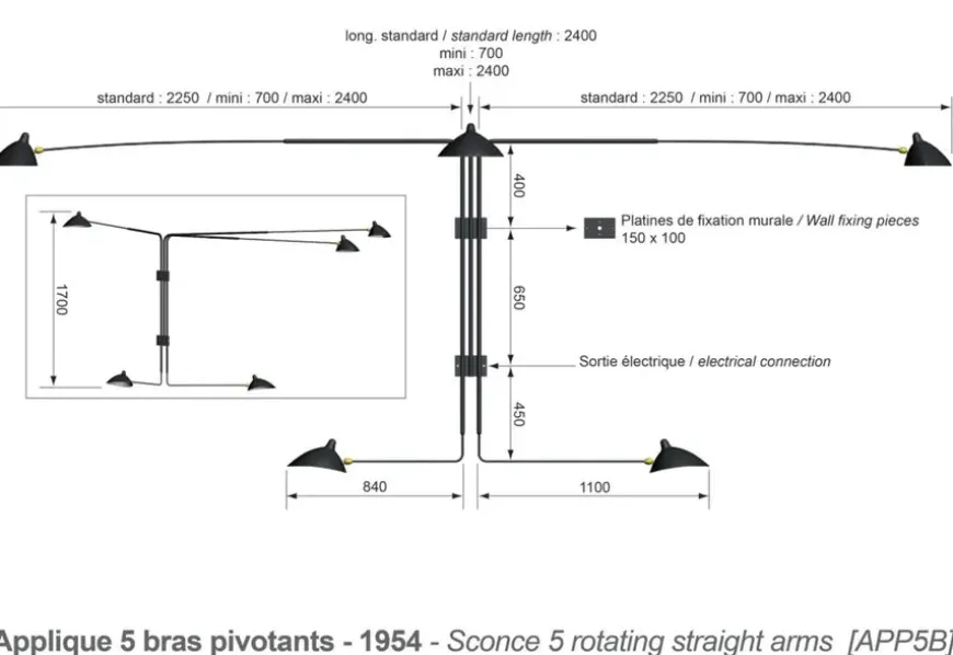 Big Wall Lamp w/5 Rotating Straight Arms af Serge Mouille