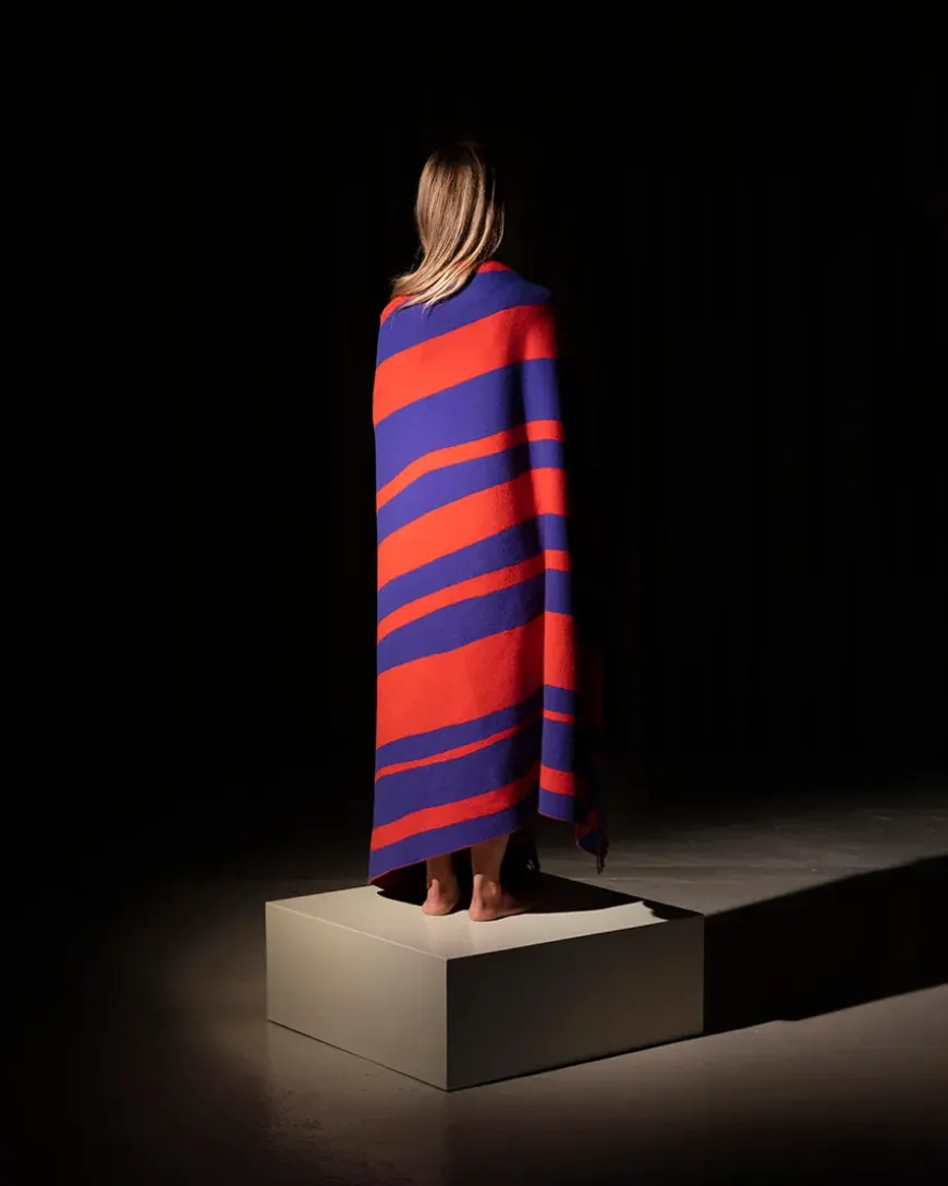De moderne Brush plaider kommer i tre forskellige farver. Her er tæppet i farven blue/red. Tæppet vil med sine farver og de små frynser i enderne pynte både i stuen og soveværelset. Plaiden vil være et ekstra statement i indretningen med de blå og røde farver.