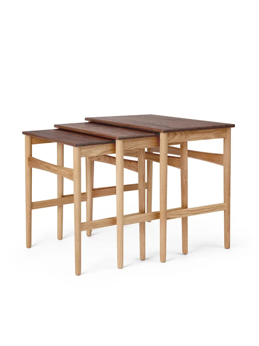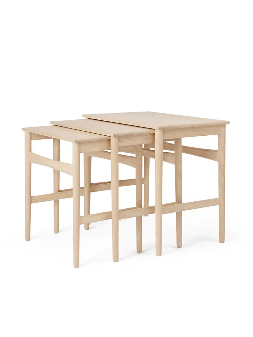 CH004 er designet af Hans J. Wegner, som var ekspert i at designe møbler, der var og er smukke, men ikke desto mindre funktionelle. Wegners ikoniske Nesting Tables blev lanceret første gang tilbage i 1952. Nu tages bordene frem igen af Carl Hansen & Søn. Indskudsbordene er praktiske og pladsbesparende. Brug dem hvert for sig som små sideborde, sofaborde eller sammensat.